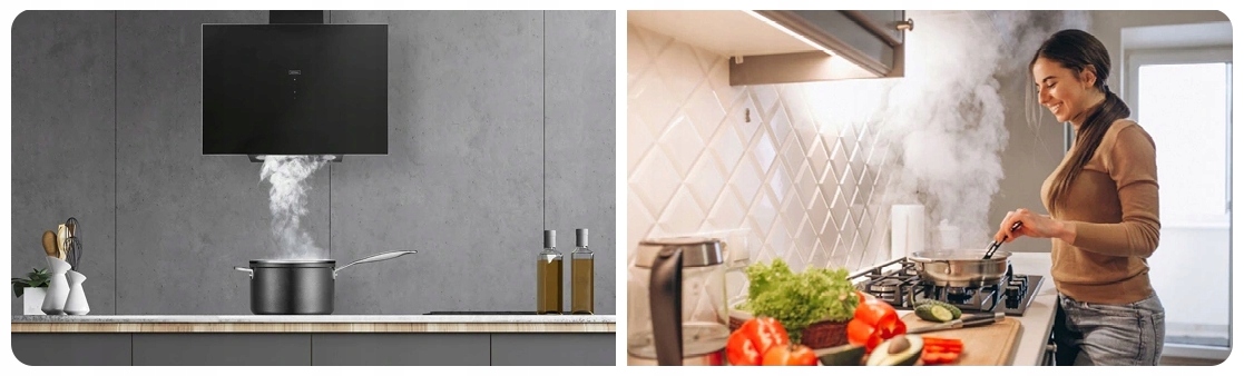 Элементы алюминиевой фильтрации капюшков, эстетически скрытые под декоративной крышкой. На поверхности капота образуется разрыв, через которую пары высосаются в местах, гарантирующих их эффективное удаление.