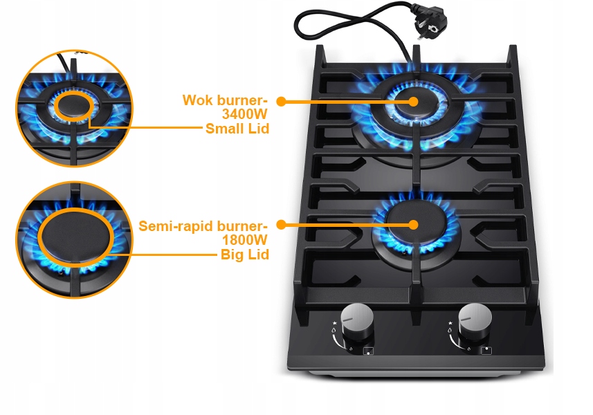 Очень мощные конфорки: газовая плита с двумя конфорками оснащена тройной конфоркой для вока мощностью 3400 Вт и полубыстродействующими конфорками мощностью 1800 Вт. Каждая конфорка подходит для посуды с плоским дном. (Диаметр дна кастрюли не меньше диаметра варочной поверхности.) Вы можете легко тушить, жарить, жарить на сковороде, готовить на разных конфорках.
