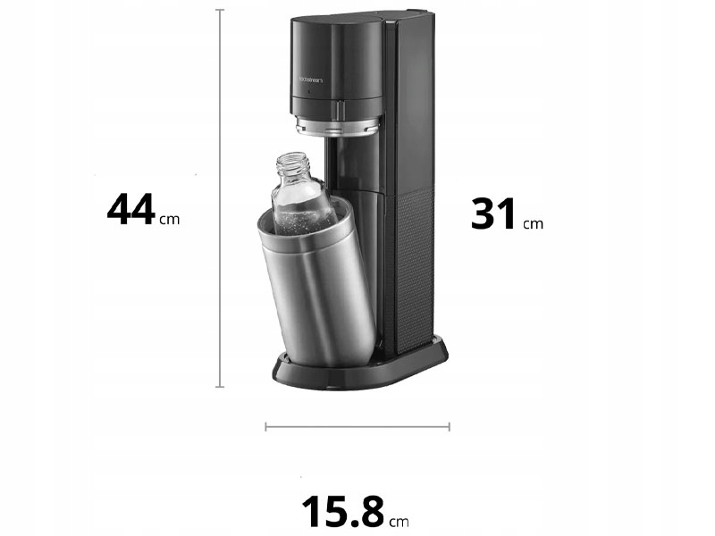 Устройство создаст пузыри в вашем любимом стиле всего за несколько секунд. Вы можете легко регулировать уровень карбонизации напитка. Кроме того, устройство не требует питания, поэтому вам будет легко его перемещать. Карбонатор не займет много места на вашей кухне. Размеры устройства: 44 см х 16 см х 27,5 см. Этоболее удобное решение, чем таскать тяжелые пакеты с водойиз магазина!