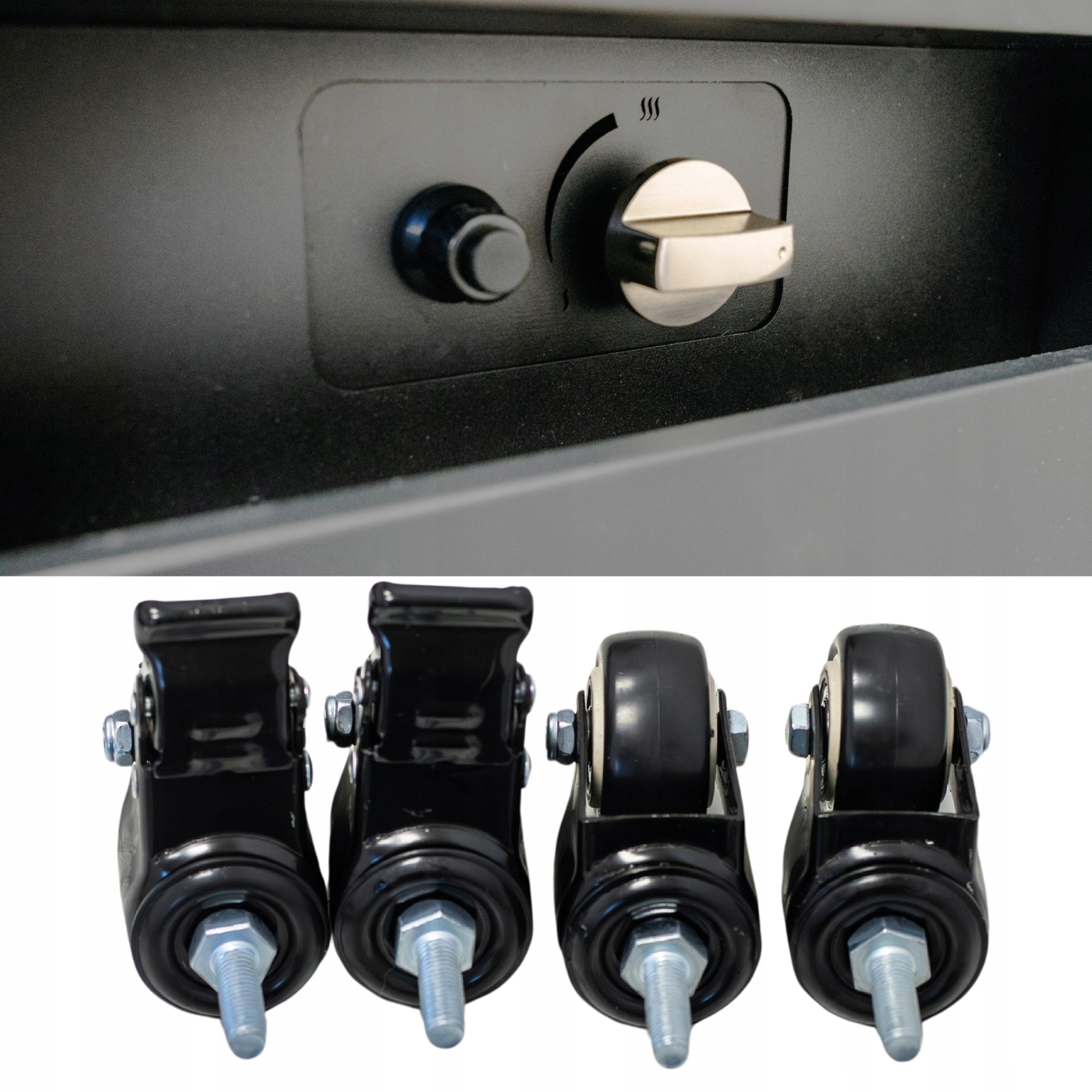 ✅Каменка оснащена четырьмя маленькими колесами, которые позволяют легко перемещать ее. Кроме того, он имеет тормозной механизм, который предотвращает случайное перемещение устройства. В комплекте есть ключ для сборки.
