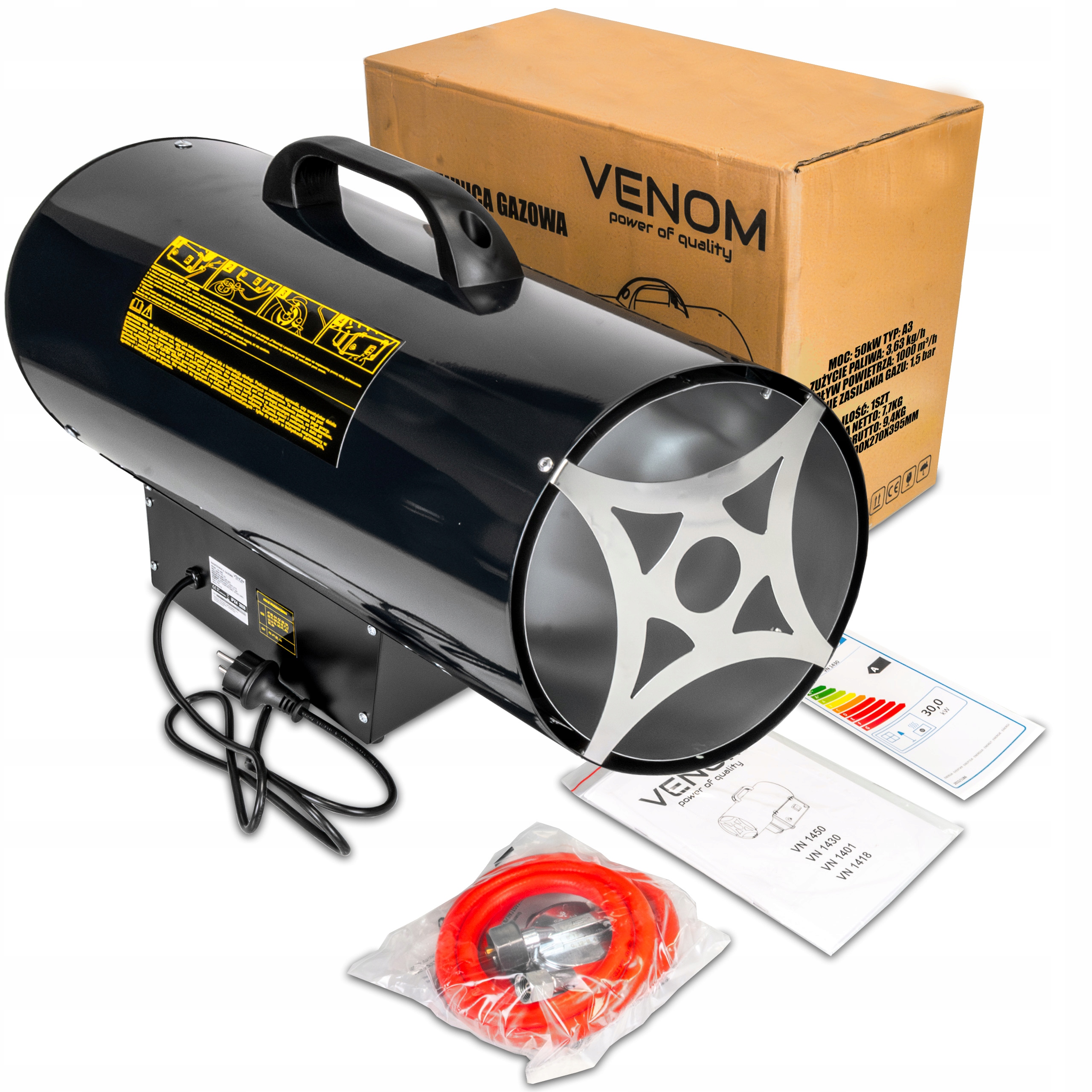 ✅ Газовый обогреватель VENOM VN 1418 - устройство впечатляющей мощностью 50 кВт, адаптированное для работы с газом пропан-бутан.