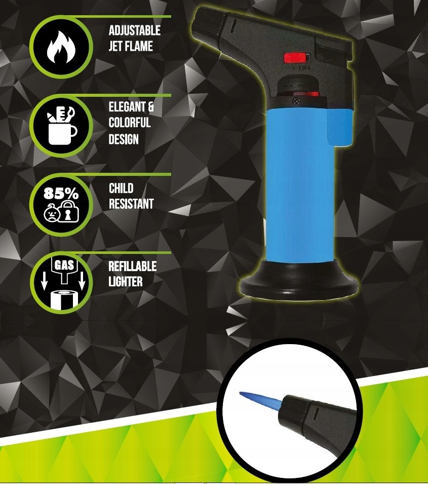 Горелка/зажигалка оснащена клапаном дозаправки газом и клапаном регулировки пламени.