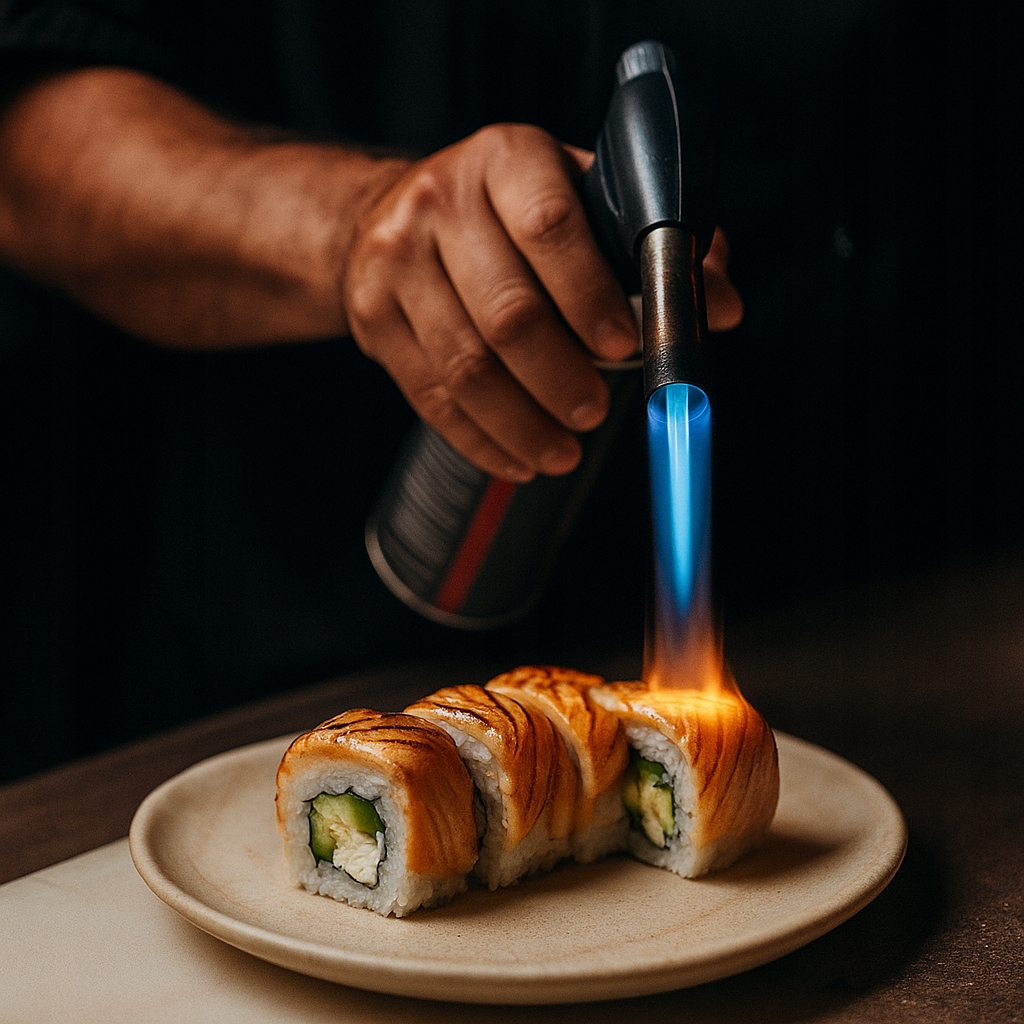 Точная отделка — добавление нежных цветовых акцентов к суши, креветкам или морепродуктам; согревающая шоколадная глазурь для украшения.