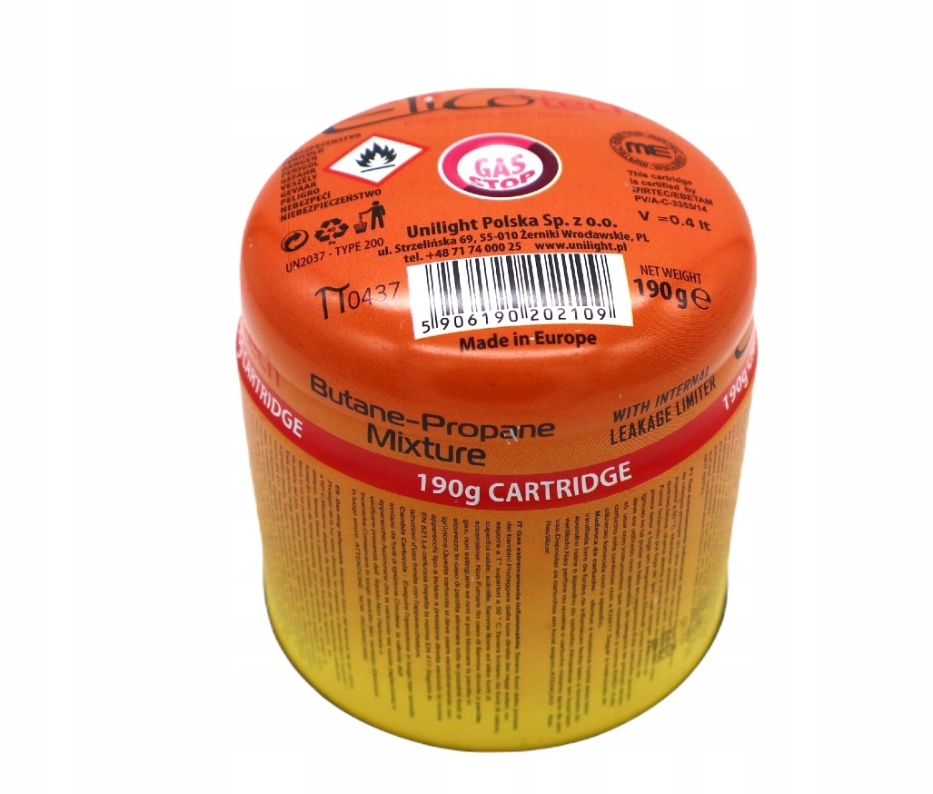 Горелка должна использоваться только с газовыми картриджами Elicocamp 190G и Elicotech 190G для пропана-бутановой смеси в соответствии с EN417 Тип 200