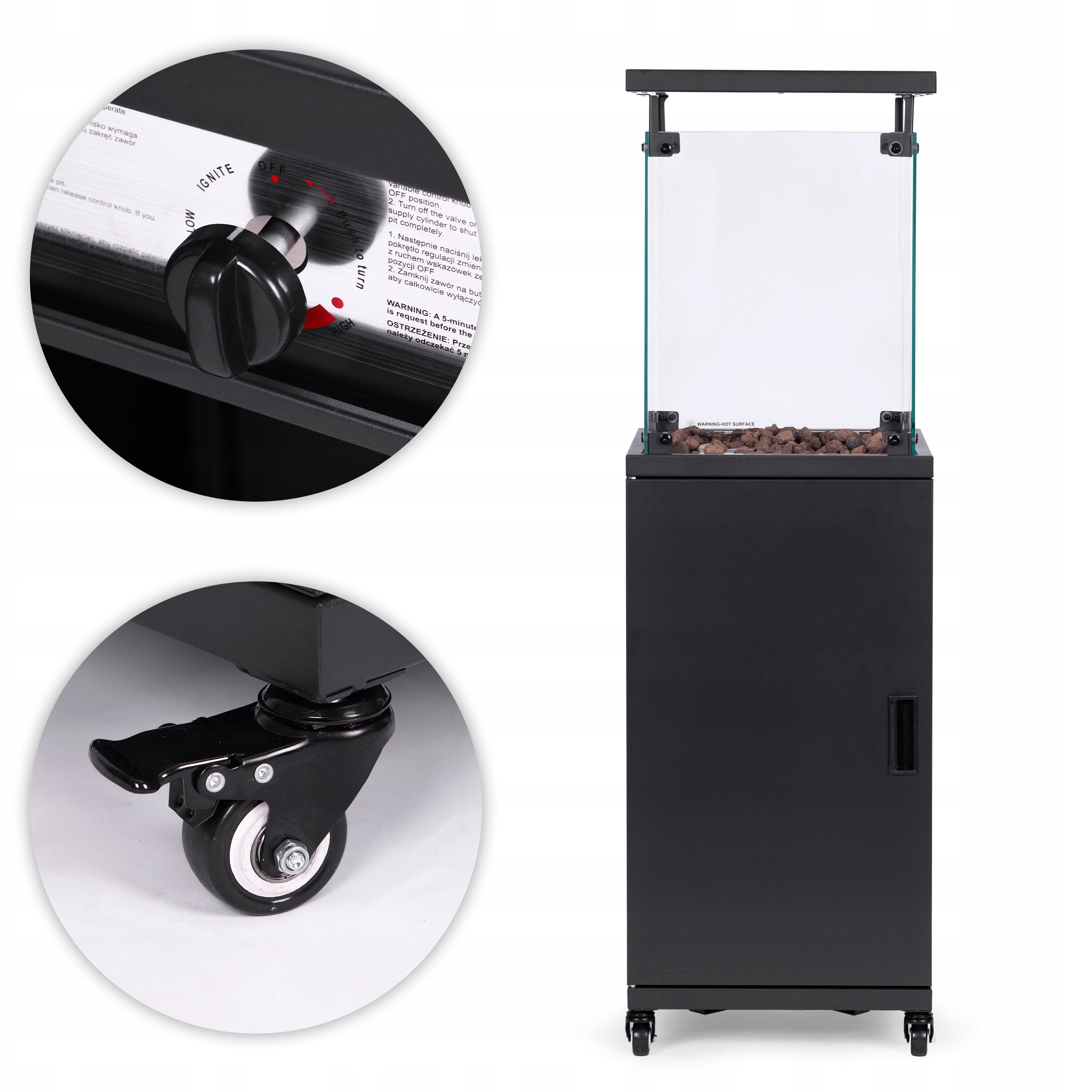 Газовый обогреватель спроектирован с учетом удобства использования. Встроенные транспортировочные колеса позволяют легко перемещать устройство, что особенно полезно, когда вы хотите менять его местоположение в зависимости от погоды или обустройства пространства. Специальные ручки обеспечивают удобное перемещение, а блокировка колес обеспечивает безопасное использование даже на неровных поверхностях. Благодаря этим решениям зонт можно разместить именно там, где он необходим, без необходимости применения силы или специальных инструментов.