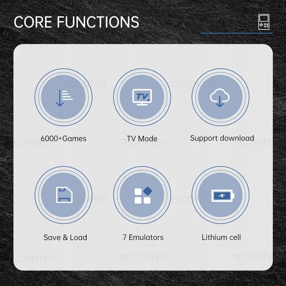 • 6000 встроенных игр. Эта консоль содержит более 6000 встроенных игр и предлагает огромную библиотеку развлечений, включая поддержку игр SF/SFC/GB/GBA.