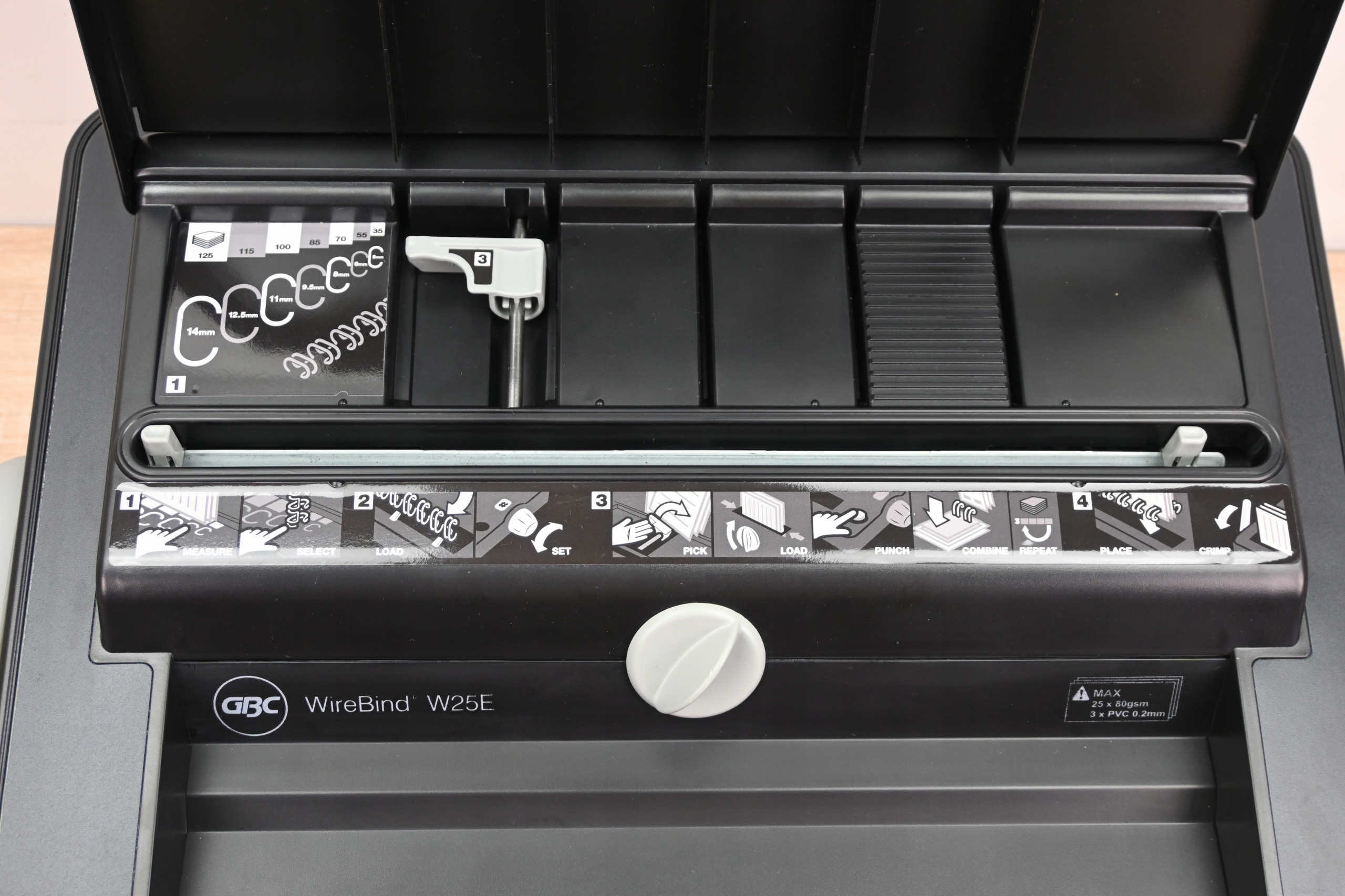 - Скрепляет до 125 листов (80 г/м²) с помощью проволочных гребенок диаметром 14 мм.