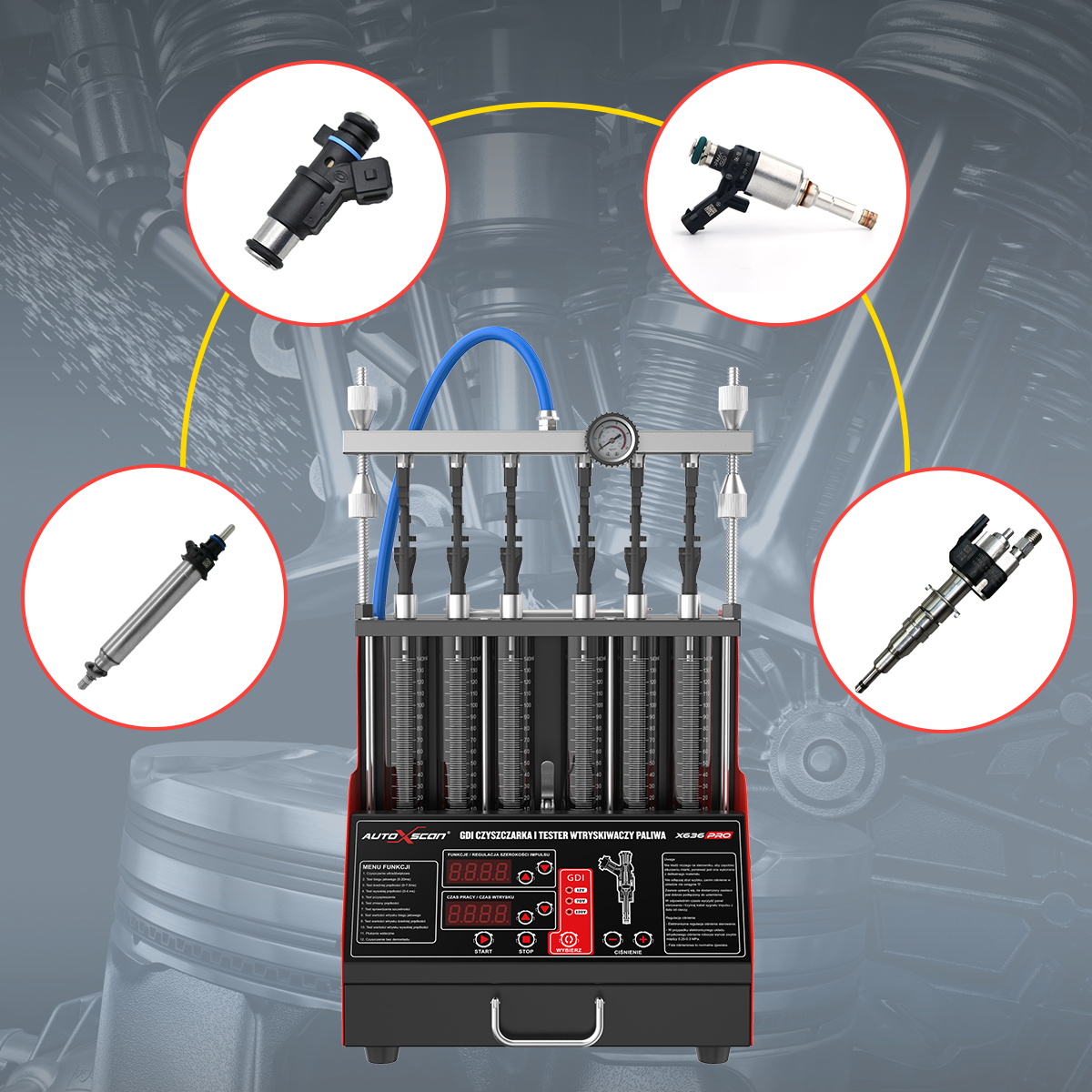 Линейка автомобильных очистителей инжекторов AUTOXSCAN включает в себя тестирование форсунок низким давлением, а также Тестирование форсунок высокого давления, которые широко используются в форсунках GDI, EFI, FSI и других типах автомобилей, мотоциклов и яхт.