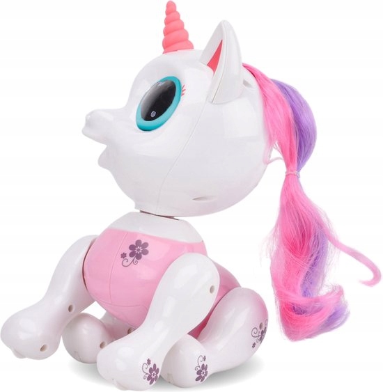 Robo Smart Unicorn-это очаровательный, интерактивный робот-робот-Unicorn, оснащенный светодиодными глазами, различными звуками и датчиками, благодаря которого Smart Unicorn реагирует на звук и прикосновение. Интеллектуальная робо-единица может ходить, сидеть, стоять и издавать звуки. Когда она проголодается, она не будет такой счастливой, и вам придется погладить ее под подбородок, пока он не будет съеден. Тогда она снова будет счастлива и танцевать с вами под ритм веселой музыки! Его длинная, розово-фиолетовая грива можно расчесывать и стилировать. Ваш сладкий, умный единорог всегда хочет играть с вами!