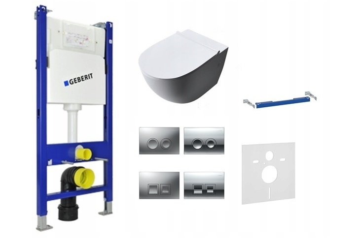 состоит из унитаза + плавно закрывающегося сиденья + скрытой рамы GEBERIT + кнопки GEBERIT Delta 21 или 50 + кронштейна GEBERIT.