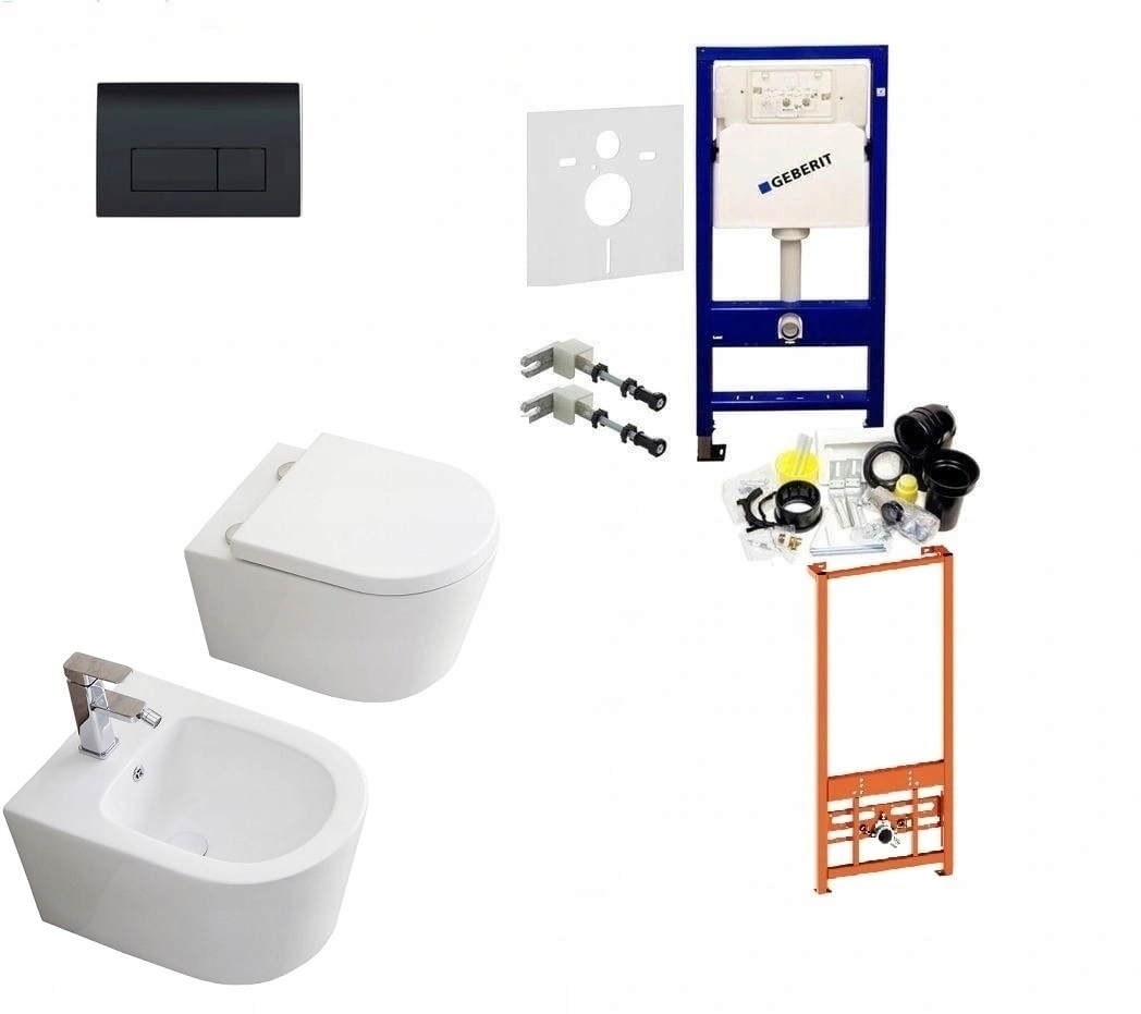 состоит из унитаза без ободка + сиденье для унитаза с плавным закрыванием (на выбор) + биде + каркас биде польского производства + скрытый каркас GEBERIT + кнопка GEBERIT delta 51 BLACK + кронштейн Geberit.