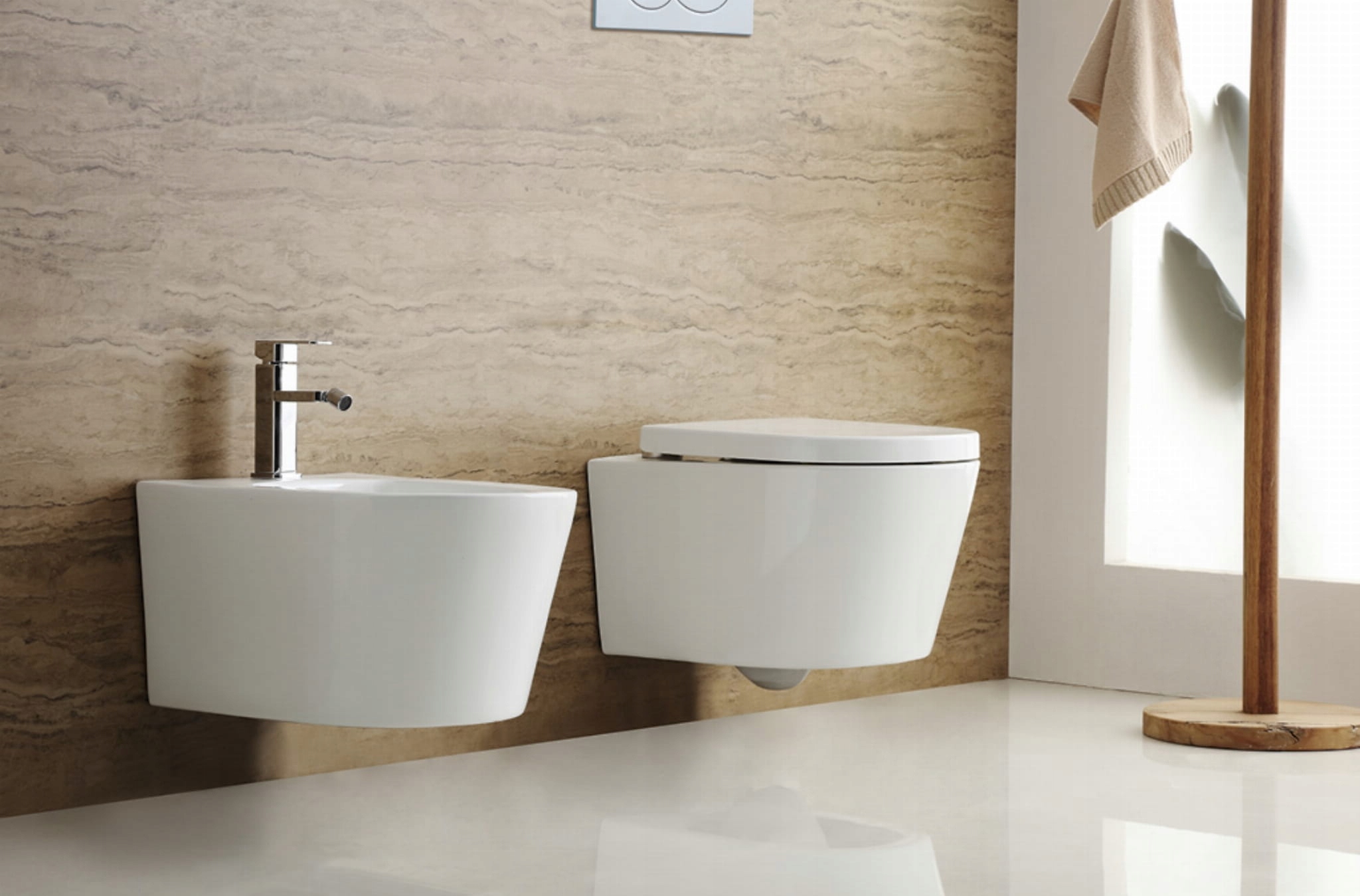 Овальный унитаз и биде овальной формы. НАНО-покрытие, невидимое невооруженным глазом, обеспечивает безупречную чистоту и антибактериальную защиту всей поверхности.
