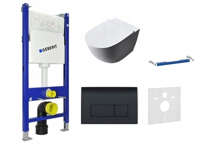 состоит из унитаза + плавно закрывающегося сиденья + скрытой рамы GEBERIT + кнопки GEBERIT Delta 51 черного цвета + кронштейна GEBERIT.