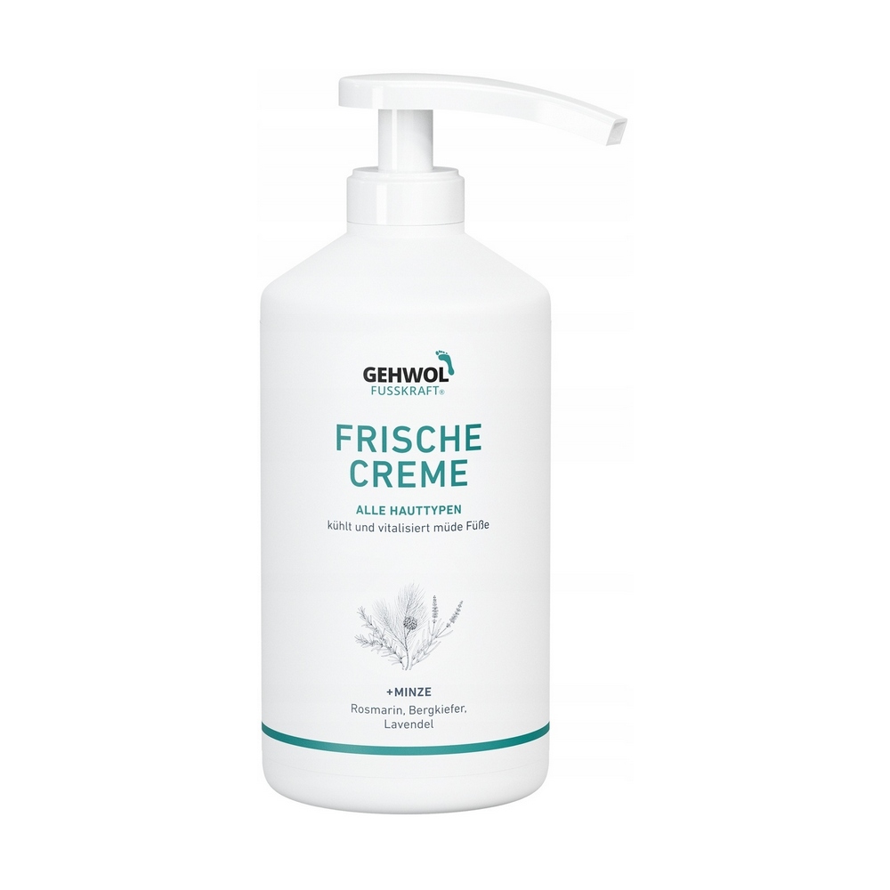 Gehwol Fusskraft Frische Creme предлагает 500 мл продукта в практической упаковке с дозатором, который облегчает использование и обеспечивает гигиенические условия использования. Крем богат натуральными ингредиентами, которые интенсивно увлажняют, питают кожу ног и обеспечивают длительное ощущение свежести.