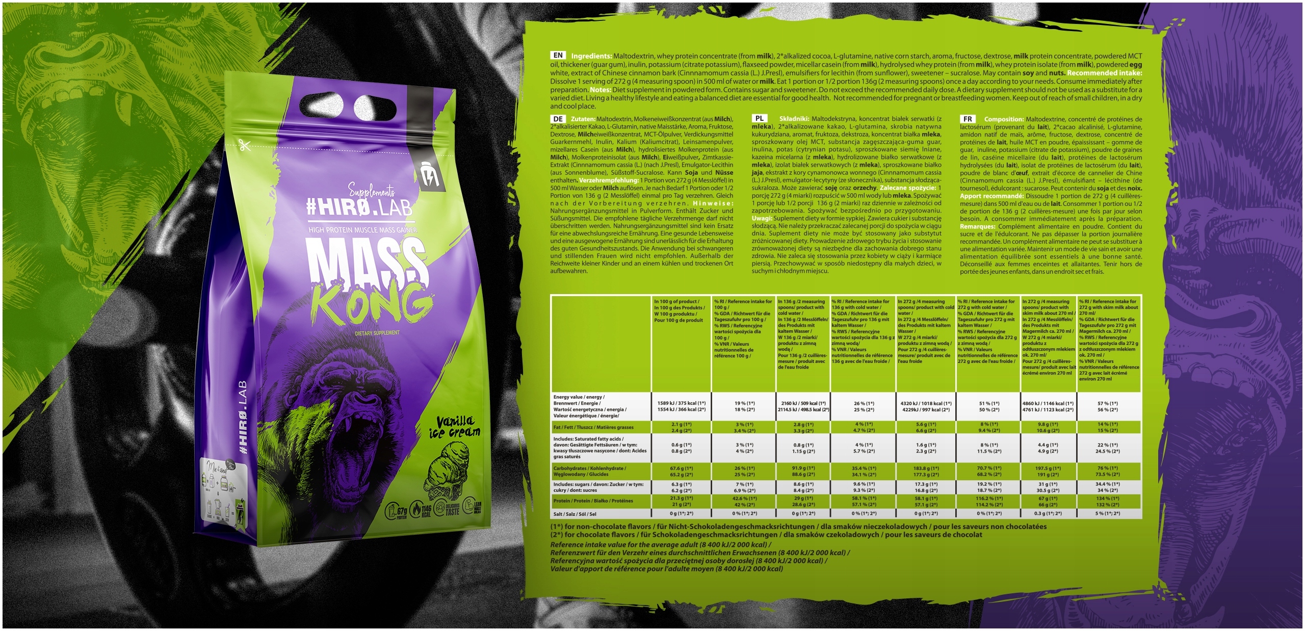 Mass Kong — эксперт в области увеличения веса тела, что приведет к увеличению вашей силы и мощи. Этот продукт от Hiro.Lab был создан специально, чтобы помочь вам достичь большего размера мышц. Благодаря коктейлю, который вы сможете приготовить всего за несколько минут, вместе с обезжиренным молоком вы обеспечите себя целых 1123 калориями на порцию. Выпивая этот анаболический коктейль между приемами пищи, вы сможете достичь размеров тела своей мечты. Будьте великолепны!