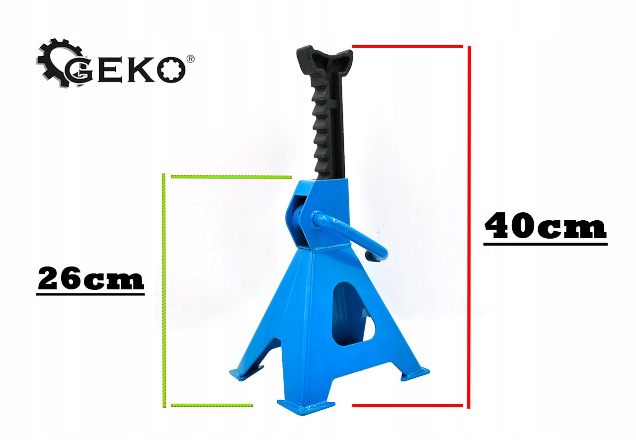 Набор подставок для автомобилей 2T очень хорошего качества, подписанных известным польским брендом GEKO. Очень прочные стойки из толстого стального листа с храповым механизмом, обеспечивающим очень точную регулировку высоты на многих уровнях.
