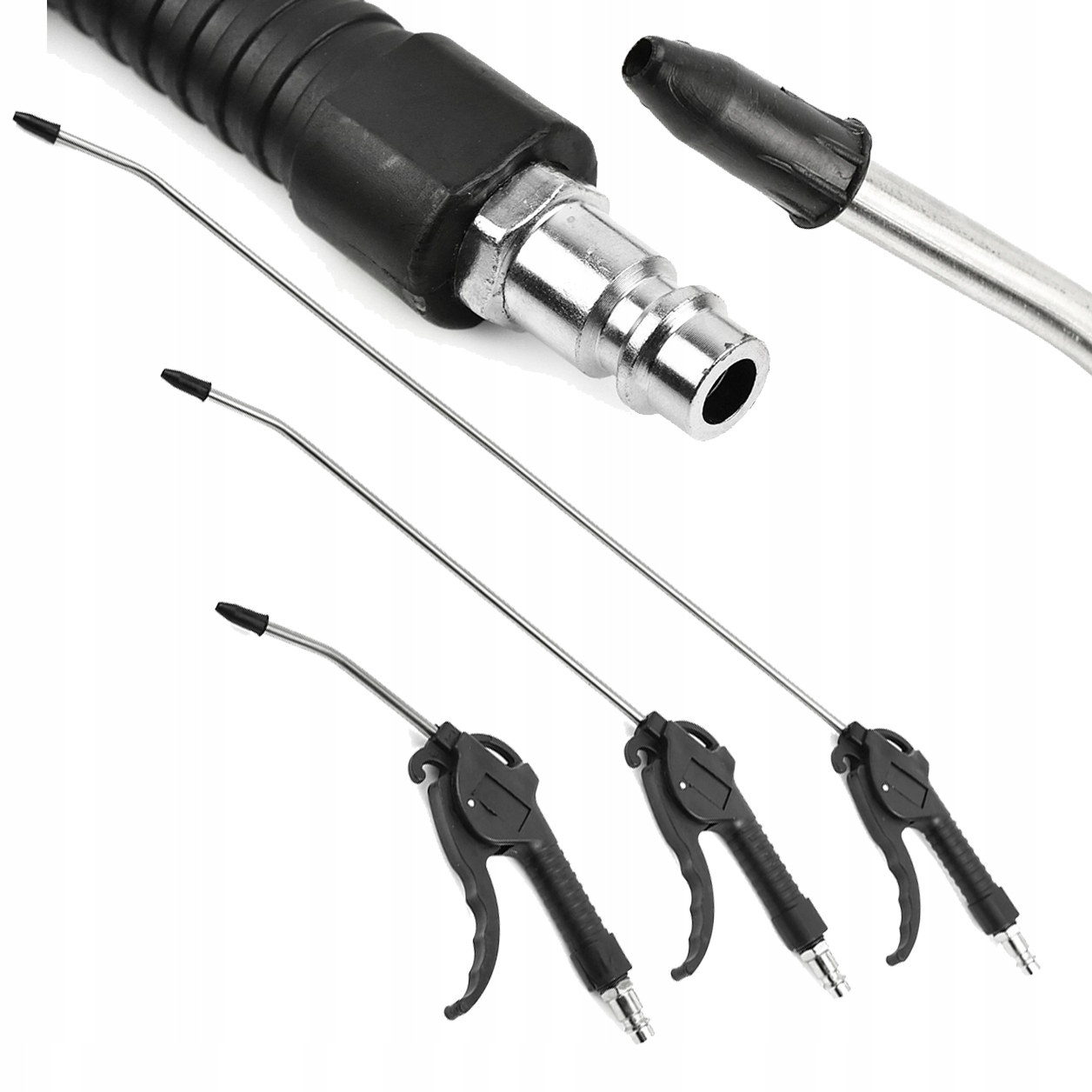 Комплект обдува, состоящий из 3-х пистолетов с насадками длиной 100/300/500 мм. Особенно полезно при уборке труднодоступных мест. Форсунки закрыты резиновыми колпачками. Оснащен стандартным воздушным соединением 1/4 дюйма.