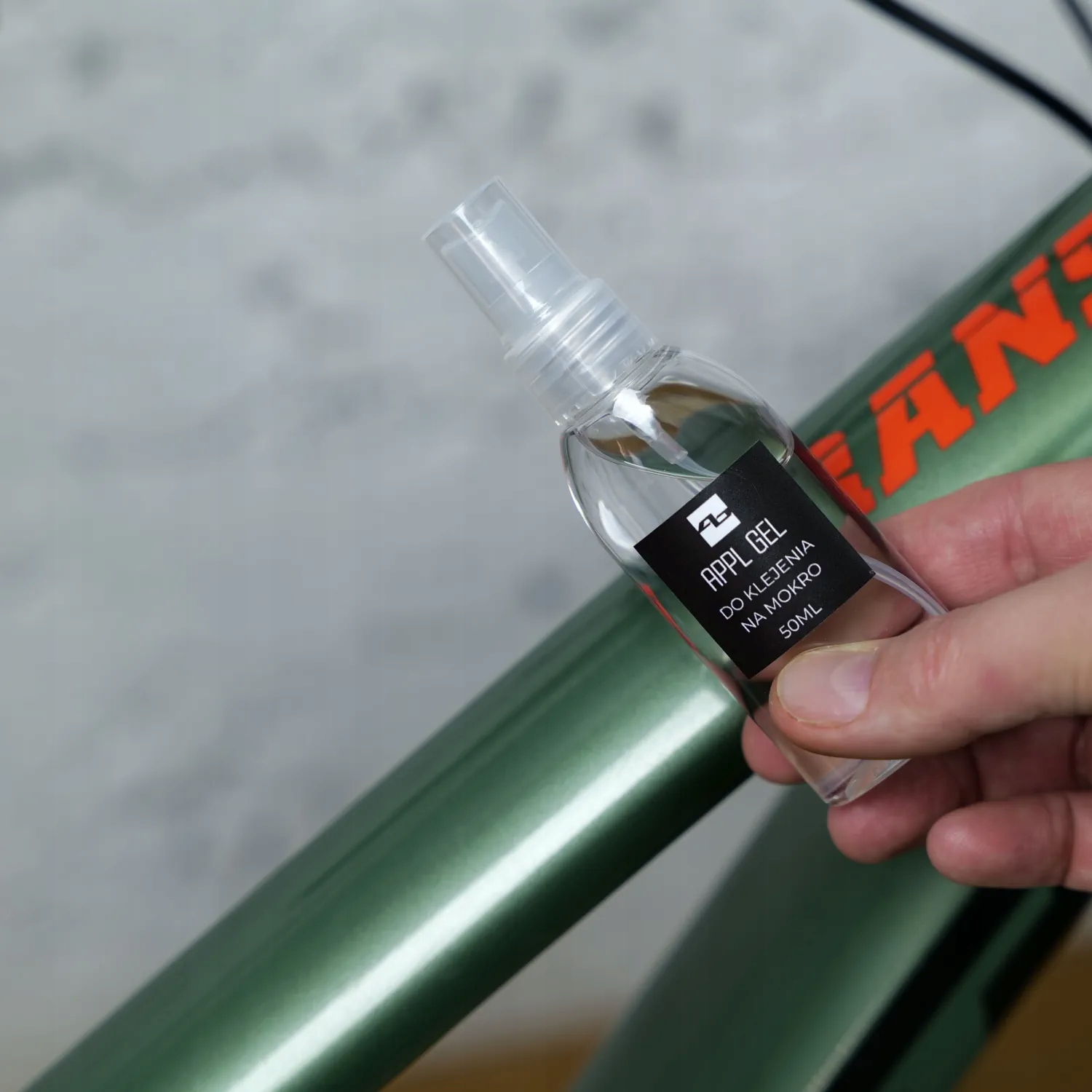 Гель обеспечивает идеальное позиционирование пленки на раме велосипеда, препятствует образованию пузырьков воздуха под пленкой и гарантирует идеальное прилегание пленки к раме велосипеда.