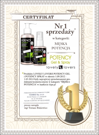 Продукты LOVELY LOVERS POTENCY GEL 150ml & SPRAY 50ml являются самыми популярными препаратами в своей категории. Это было бы невозможно без сотен довольных клиентов. Вот почему серия LL POTENCY отмечена сертификатом «№ 1 по продажам» в категории: МУЖСКАЯ ПОТЕНЦИЯ. Это название они заслужили, благодаря самым высоким продажам и благосклонным отзывам покупателей. Спасибо!