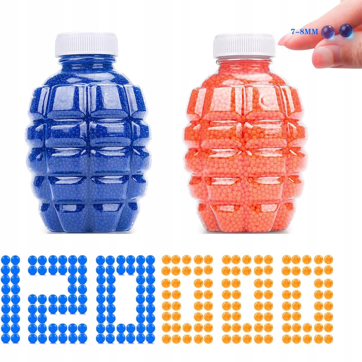 В набор входят 2 бутылки, каждая бутылка содержит 60 000 водяных шариков (синих/оранжевых), всего 120 000 водяных шариков. Гелевые шарики находятся в бутылочке, которую можно брать с собой куда угодно. Размер бутылки около 10*6,5 см (В*Г). Их можно использовать повторно по мере необходимости.