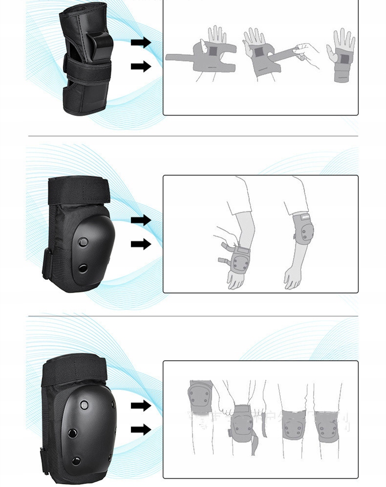 Многофункциональный защитный комплект 6 в 1 - Удобный защитный комплект включает в себя наколенники, налокотники и защиту запястий для катания на скейтборде, езды на велосипеде, скалолазания, езды на велосипеде, катания на коньках, катания и других экстремальных видов спорта. Утолщенная конструкция будет более удобной и безопасной в мультиспорте.