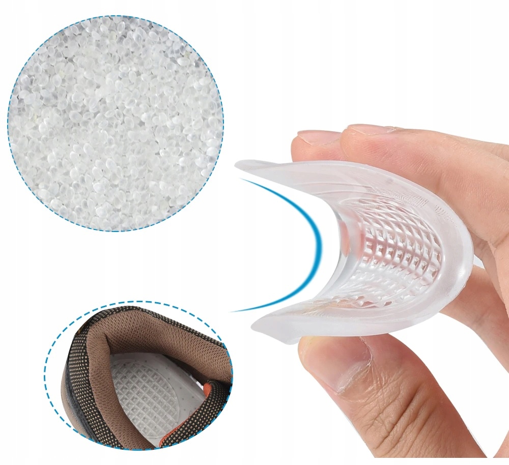 Высококачественные гелевые пяточные носки из прочного силикона который легко адаптируется к ноге. Уменьшается давление тела на пятку, что очень важно при пяточной шпоре. Они повышают комфорт при ходьбе, помогают разгладить кожу стоп и предотвратить образование мозолей. Стельки приклеены к обуви - не смещаются при ходьбе.