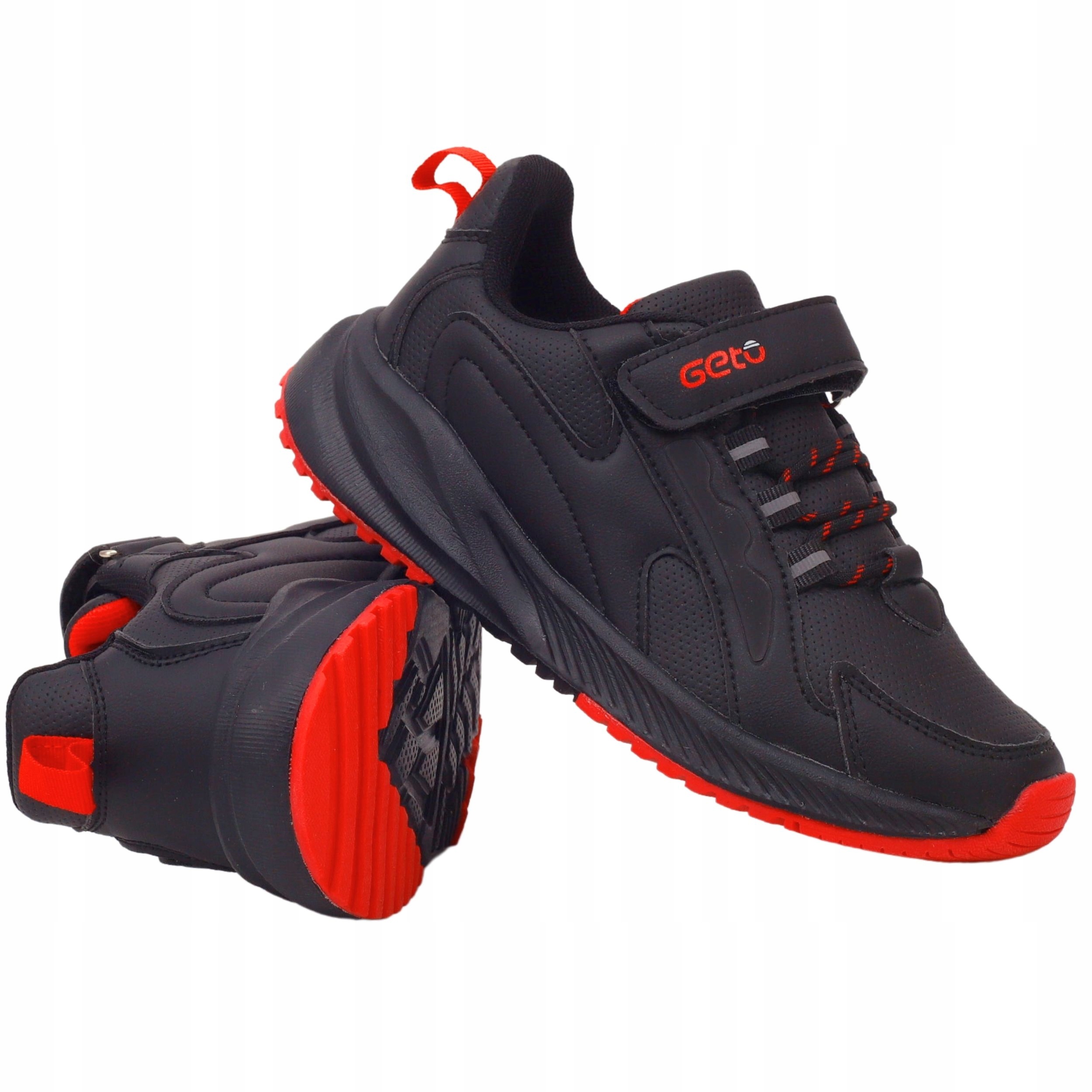 Мальчики с черными туфлями на липучке с красными элементами. Идеально как повседневная обувь. Кроме того, они легкие, мягкие и обеспечивают удобство и комфорт использования. Кожаная вставка. Закрепитель на липучке облегчает поставку на обувь.