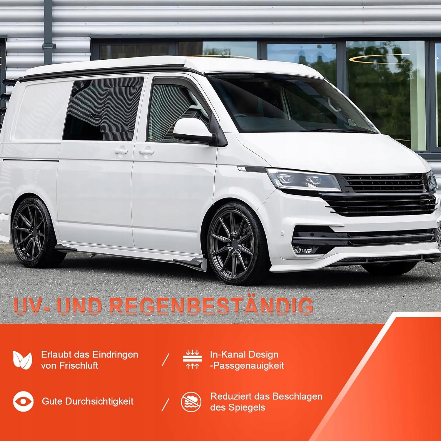 Белый фургон с графикой, показывающая: «Лассен Фриш Люфт Рейн», «Эйнфахер Эйнбау» и «Индивидуальная фенстер». Оранжевые стрелки указывают воздушный поток возле стекла.