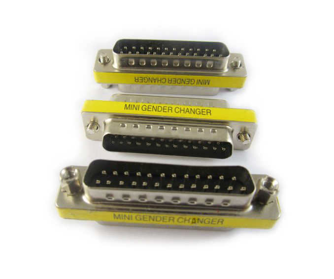 Качественный гендерный адаптер позволяет соединить два кабеля или поменять конец с «папа» на «мама» у кабеля или розетки. Разъемы называются LPT DB25 или D-SUB25.