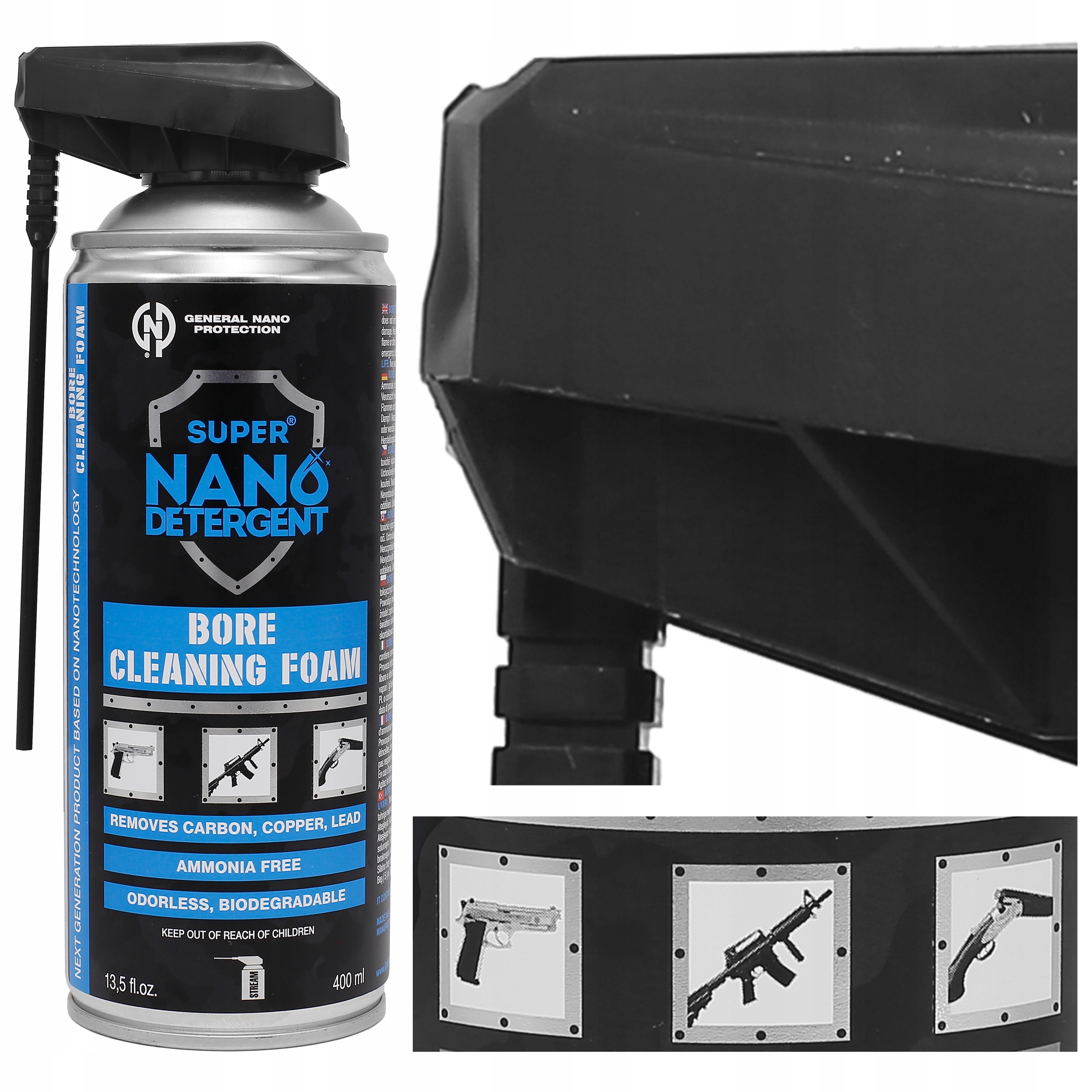 Общая нано -защита 400 мл ствола представляет собой специализированный ствол для очистки ствола в виде активной пены , которая проникает в поверхность металла и растворяет нагар, свинец и другую грязь, оставляя тонкий слой защитного масла