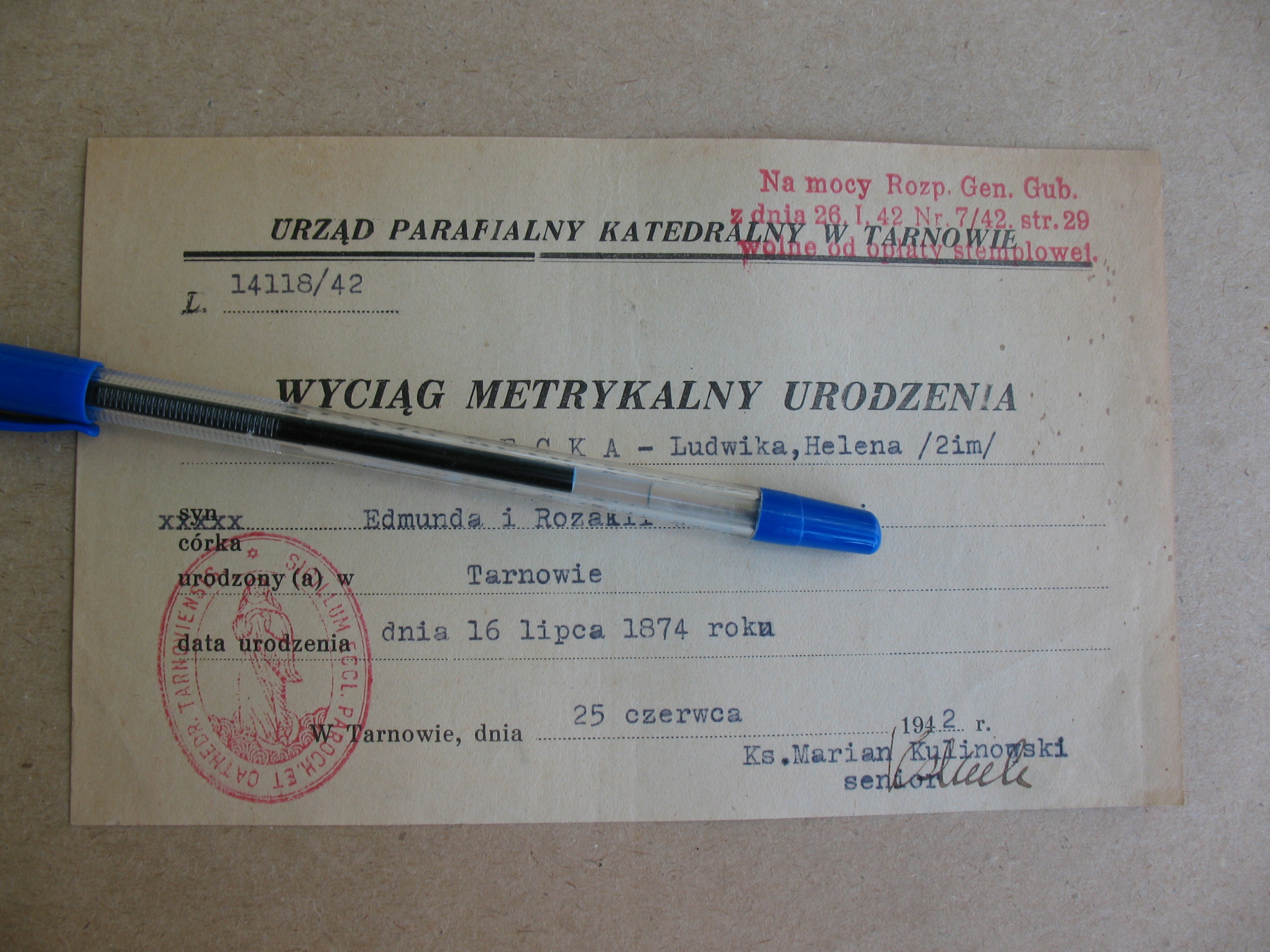 GENERALNA GUBERNIA TARNÓW WYCIĄG METRYKALNY URODZENIA 1942