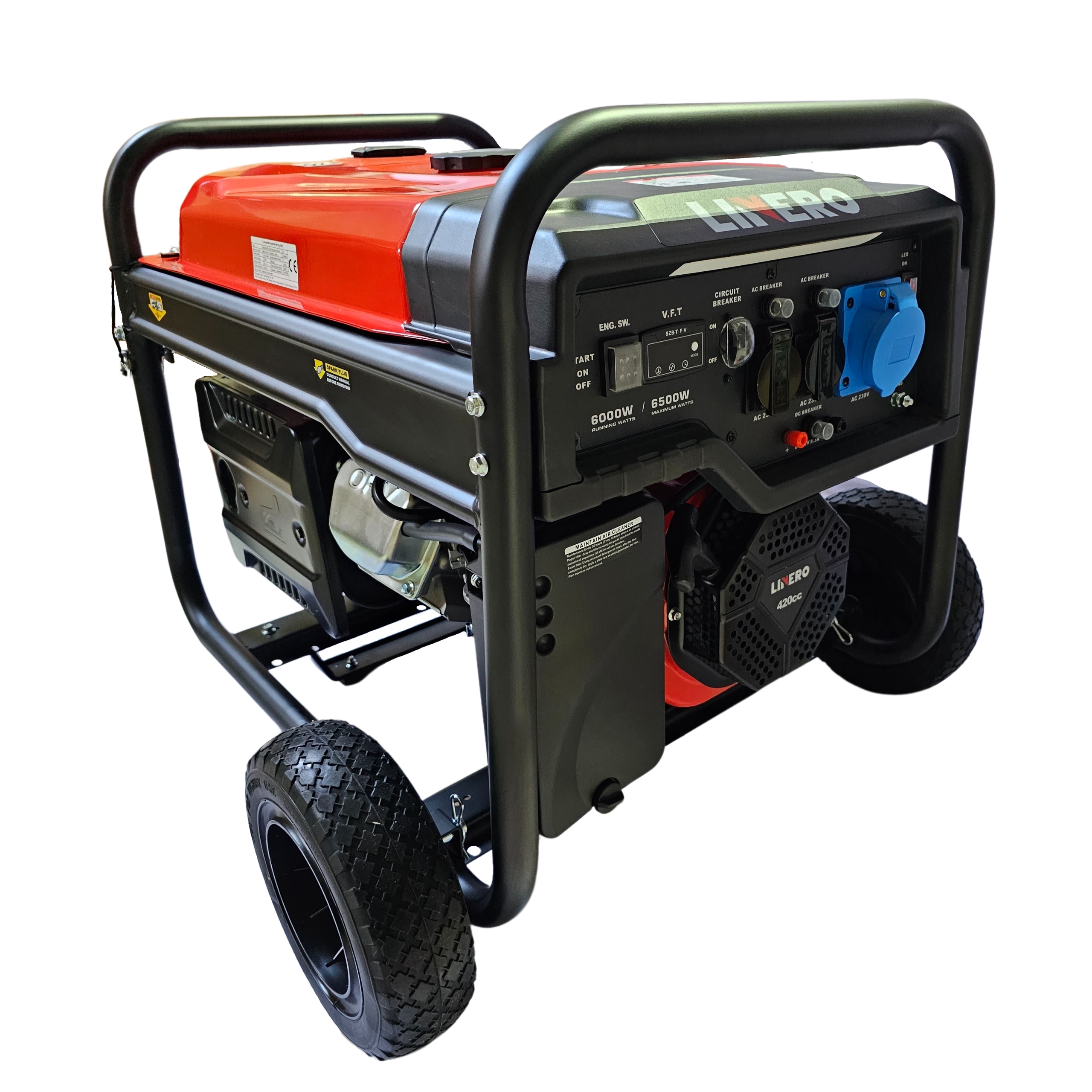 LINERO R6000D 6–6,5 кВт, 1 ФАЗА, БЕНЗИН, ЭЛЕКТРОСТАРТЕР, СТАБИЛИЗАЦИЯ НАПРЯЖЕНИЯ AVR, БОЛЬШОЙ ТОПЛИВНЫЙ БАК ОБЪЕМОМ 28 ЛИТРОВ, КОЛЕСА И СКЛАДНАЯ РУЧКА