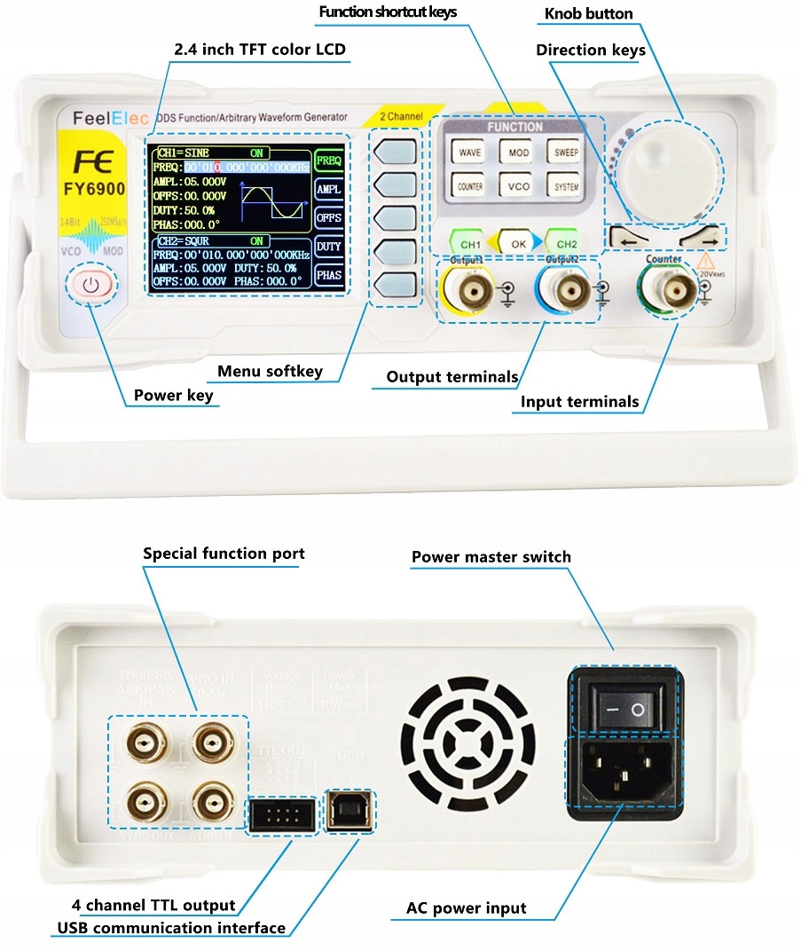 Предлагаемая новая серия генераторов FY6900 от FeelTech основана на известной серии FY6600. Выходные параметры осциллограмм практически идентичны. Основное отличие – механическое строение кнопок на передней панели. В моделях серии FY-6900 используются резиновые функциональные кнопки (быстро отвечая на вопрос, в чем разница между FY6600 и FY6800).