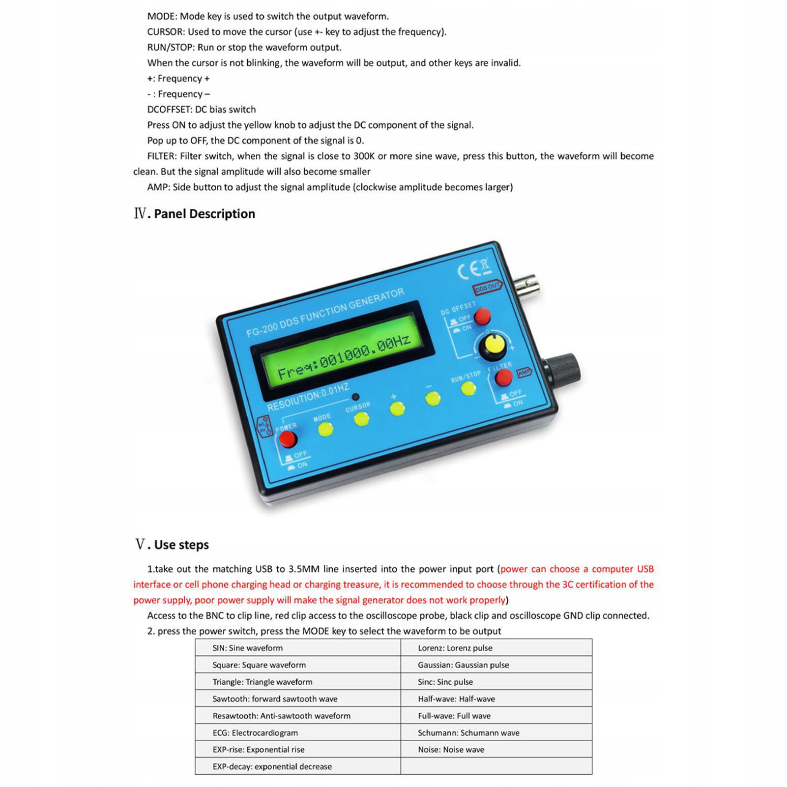 1. Формы выходных сигналов: синусоидальная волна, прямоугольная волна, треугольная форма волны, прямая пилообразная форма волны, обратная пилообразная форма волны, форма волны электрокардиограммы, экспоненциальный рост, экспоненциальный спад, синхроимпульс, полуволна, полная форма волны, форма шума и т. д. 15 видов сигналов
