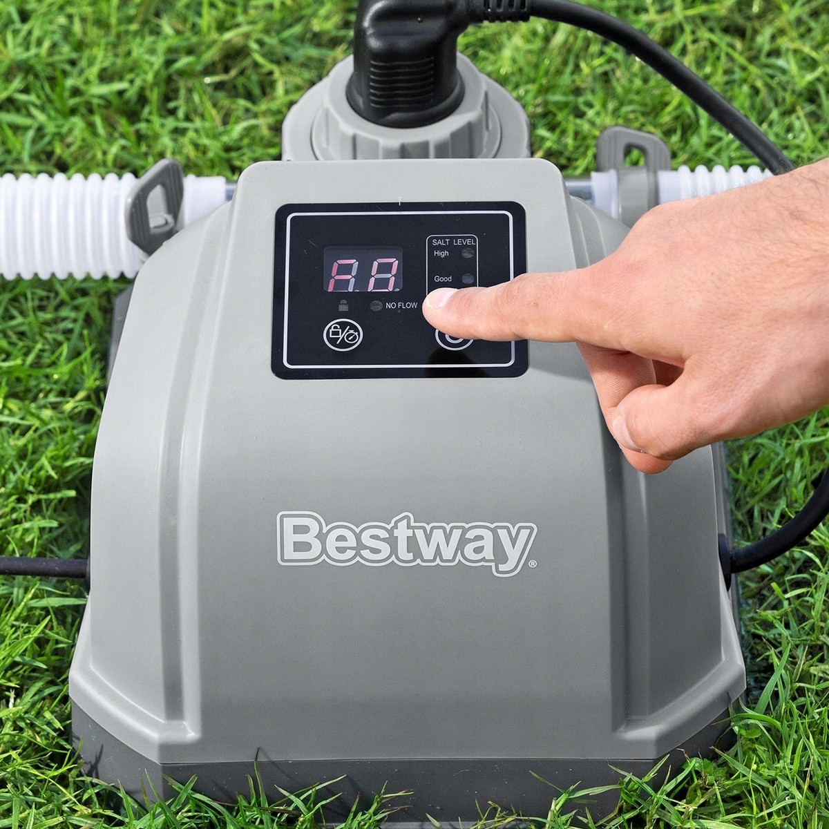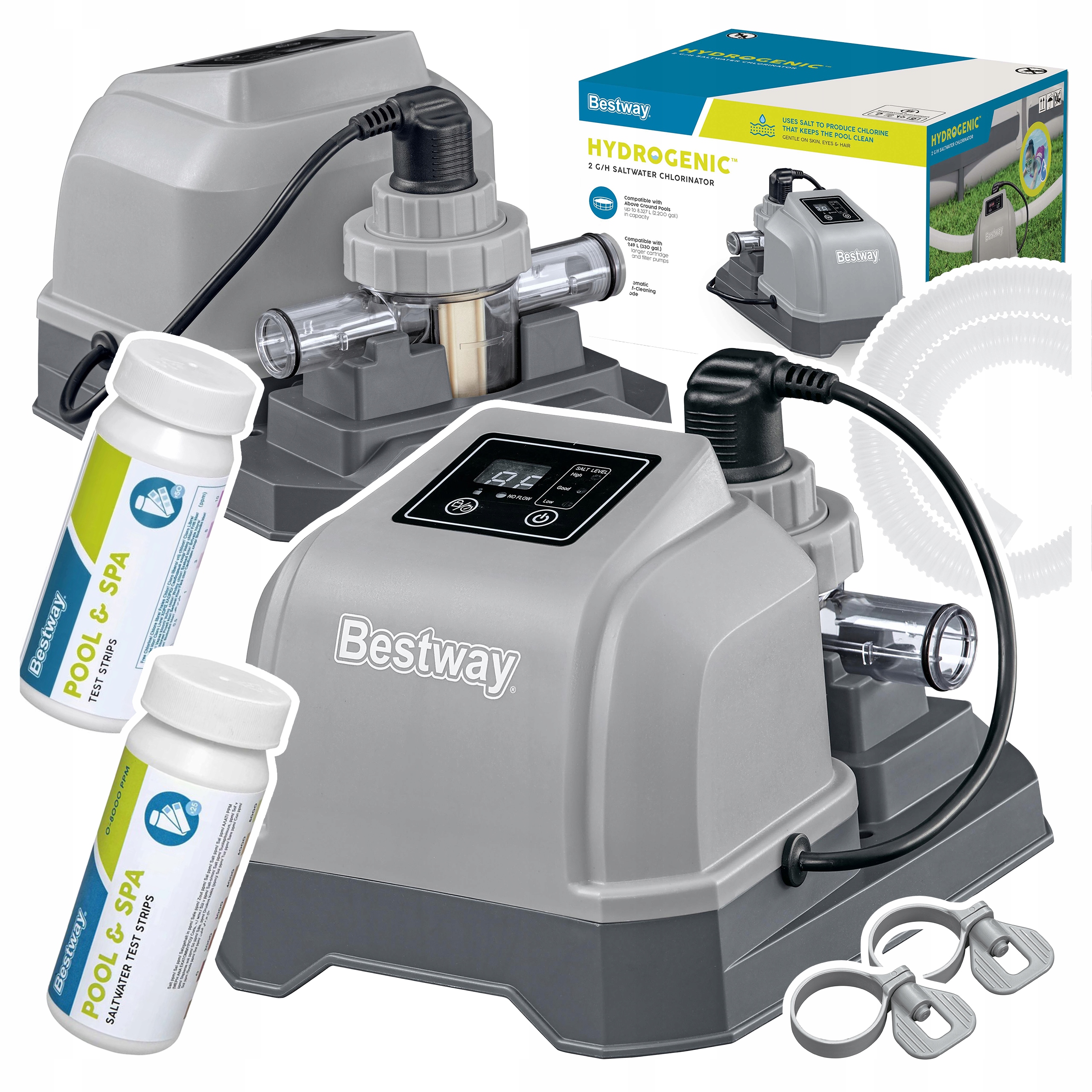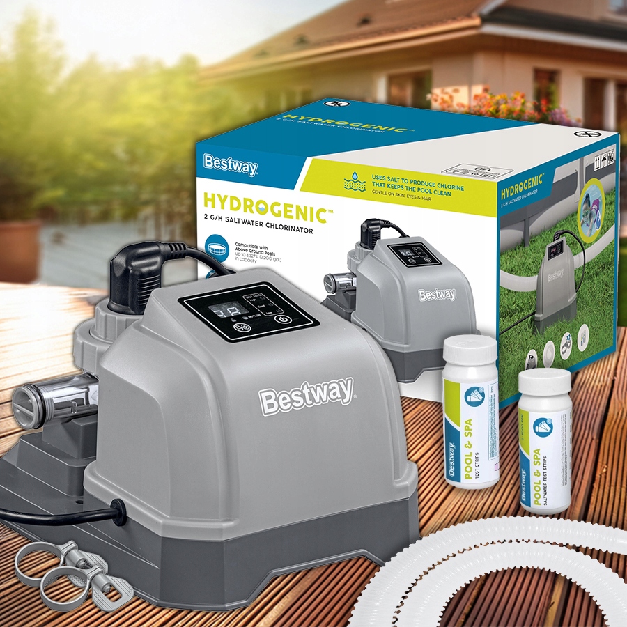 убивает микробы в бассейне, но это деликатно для кожи Bestway® Hydrogenic ™. Используя инновационные технологии, водородный хлоратор превращает соль в небольшое количество бактерий, убивающих хлор, так что бассейн является кристально чистым.