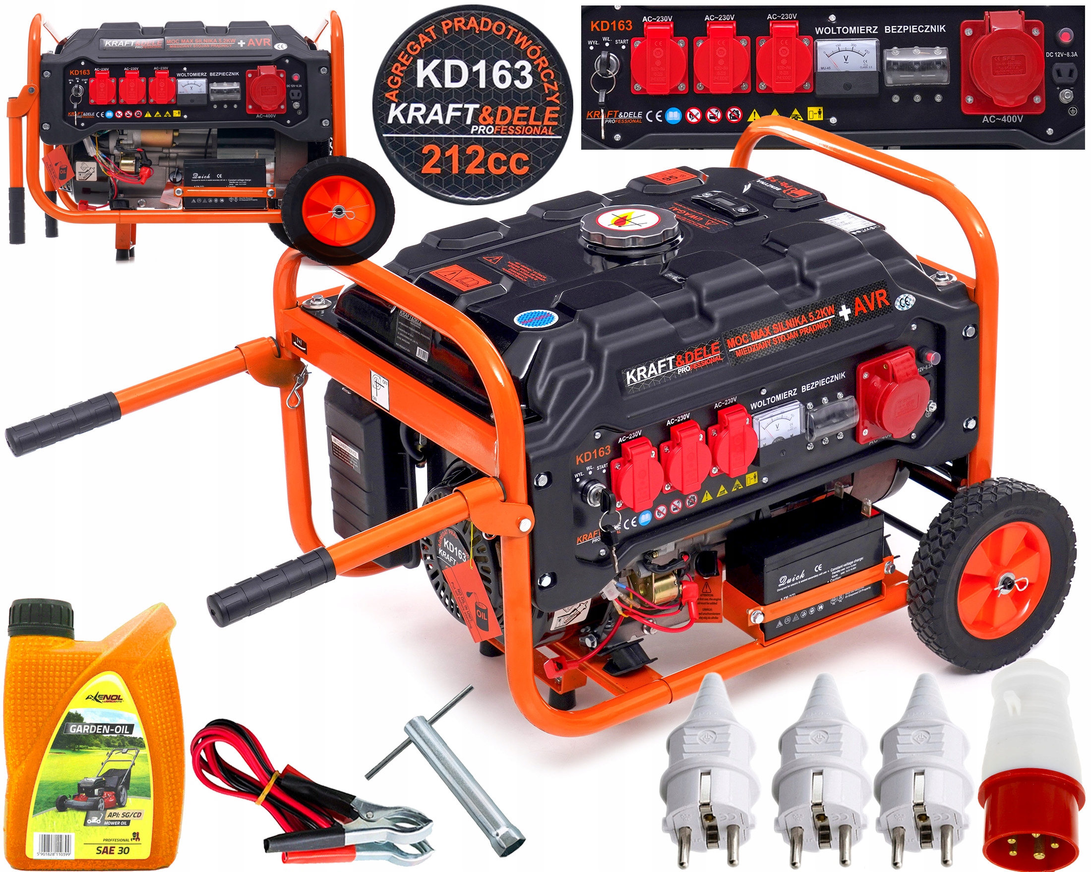 ГЕНЕРАТОР серии KRAFT&DELE Professional™ С ЧЕТЫРЕХТАКТНЫМ ДВИГАТЕЛЕМ 5200Вт 7л.с. МЕДНЫЙ ГЕНЕРАТОР 3500Вт 400В 3x230В 12В НА РАМЕ, РУЧКЕ + ТРАНСПОРТНЫЕ КОЛЕСА + масло, предназначенное для двигателей электрогенераторов