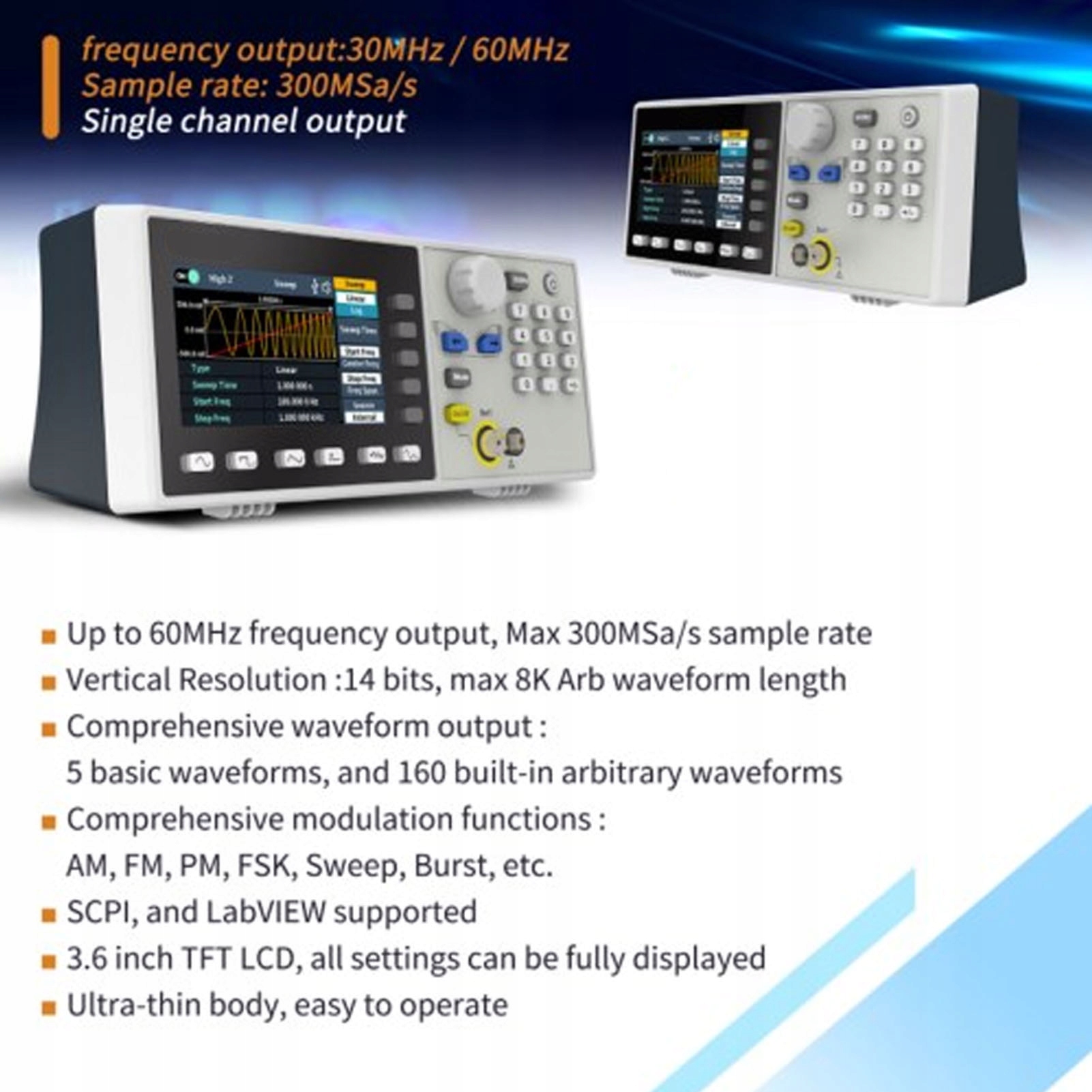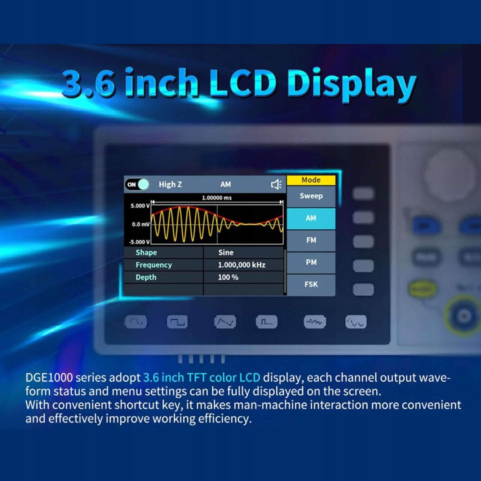 5. Обширная функциональность: генератор сигналов DGE1030 предлагает несколько встроенных форм сигналов, определяемых пользователем, а также сигналов произвольной формы, типы модуляции AM, FM, PM, FSK, а также 3,6-дюймовый TFT ЖК-дисплей для комплексного и удобного использования.