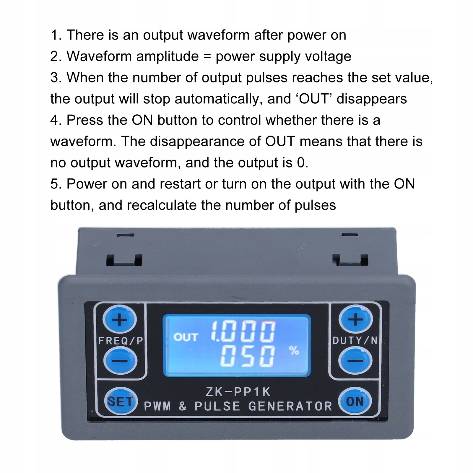 - Длина ширины положительной и отрицательной Импульс: от 0,000 с до 9999 с, минимальная настройка составляет 1 мс