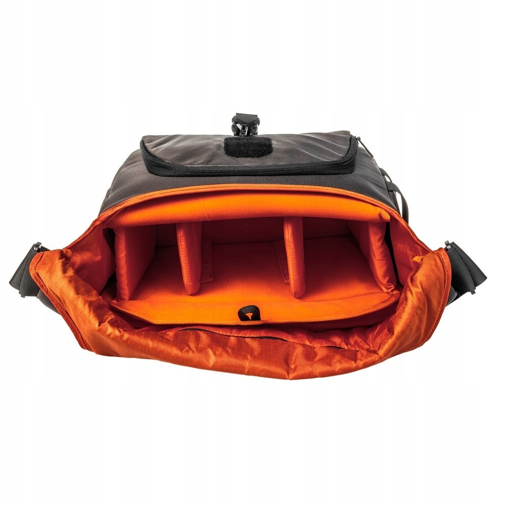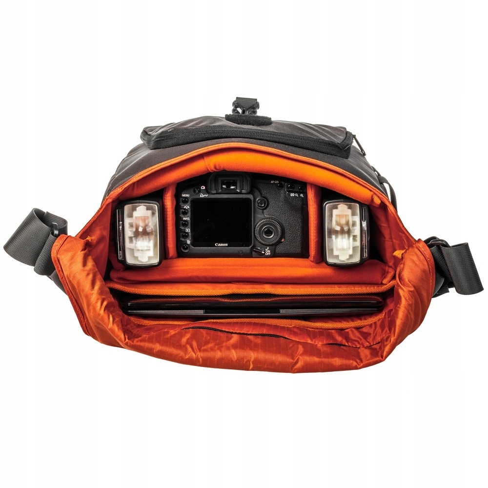 Клапан имеет двойную фиксацию. Классический ремешок на кнопке дополнительно оснащен липучкой. Кроме того, легкий доступ к внутренней части основного отделения обеспечивается застежкой-молнией по верхнему краю сумки. Под клапаном имеется карман на молнии для мелочей. Поддерживать порядок стало проще благодаря органайзеру для ручек, фильтров, мобильных телефонов и других мелких предметов. Полностью открыв клапан или расстегнув верхнюю молнию, вы получаете полный доступ к перевозимому оборудованию. В отдельном компьютерном отсеке легко разместится ноутбук. На фото ниже — ноутбук с диагональю 12 дюймов.