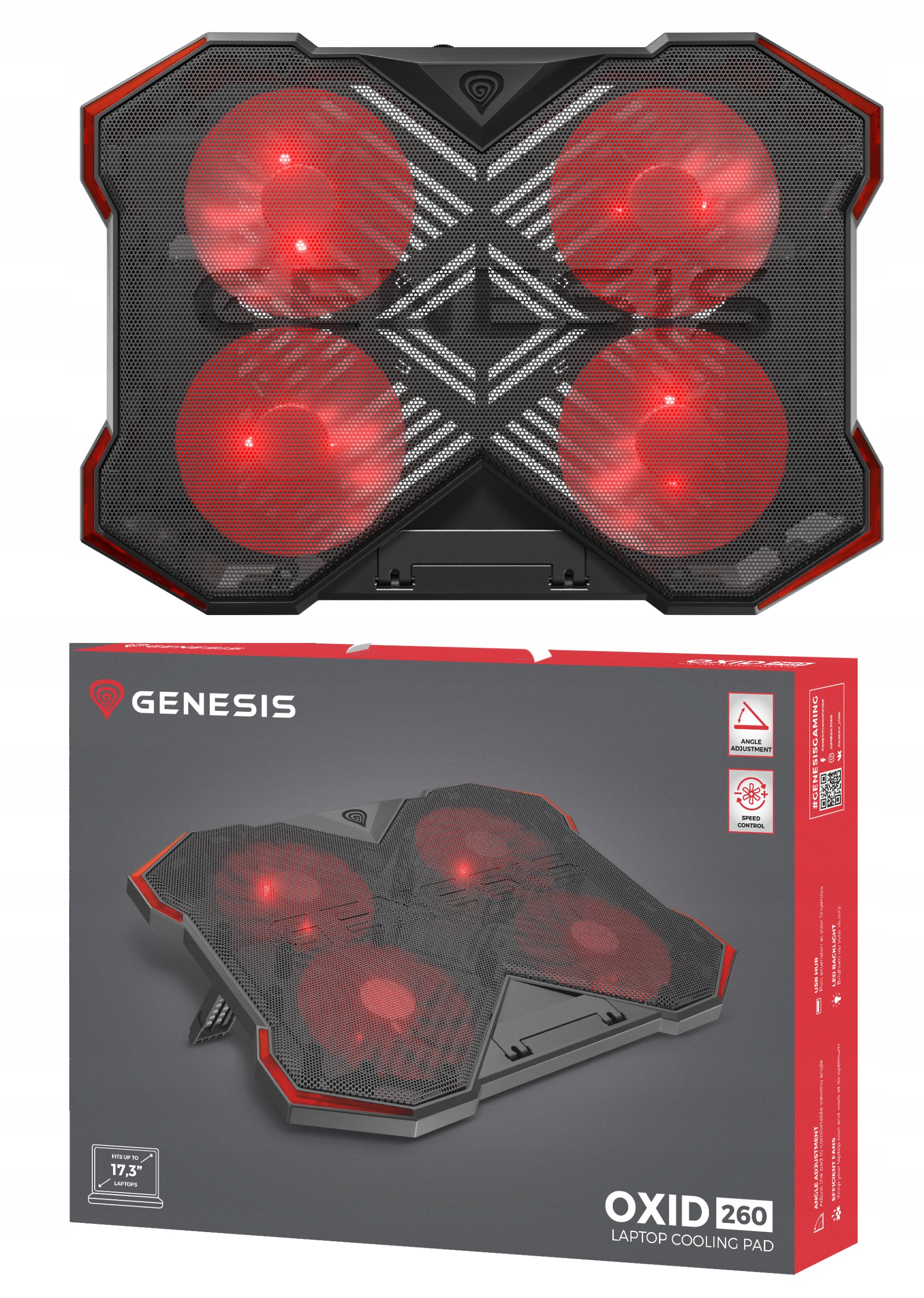 Genesis Oxid 260 был разработан для ноутбуков с диагональю до 17,3 ". Эффективная циркуляция воздуха обеспечивается металлической панелью с отверстиями на передней части , а резиновая поддержка у основания будет защищать ваш мобильный компьютер, а сознание от его подключения к выпадению его на поверхность в отставке на его на поверхности будет защищать его на основе.