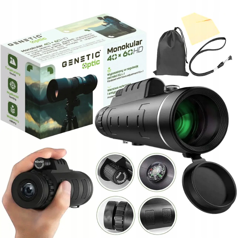 Монокуляр GENETIC® 40x60 HD — это компактный и в то же время чрезвычайно оптически совершенный инструмент, который обеспечивает яркое, детализированное изображение — независимо от погодных условий. Хорошо работает как в поле, так и в городских джунглях.
