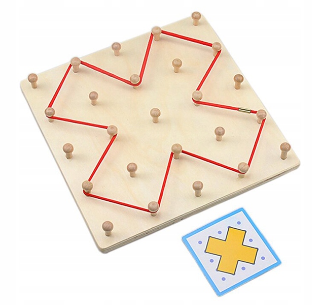 Это деревянная доска с прикрепленными колышками. на равных расстояниях, на которых ребенок может натягивать резинки для создания фигур. Он предполагает создание определенных узоров с помощью резинок (схемы доступны на обратной стороне коробки) – способствует развитию логического мышления и творческих способностей.