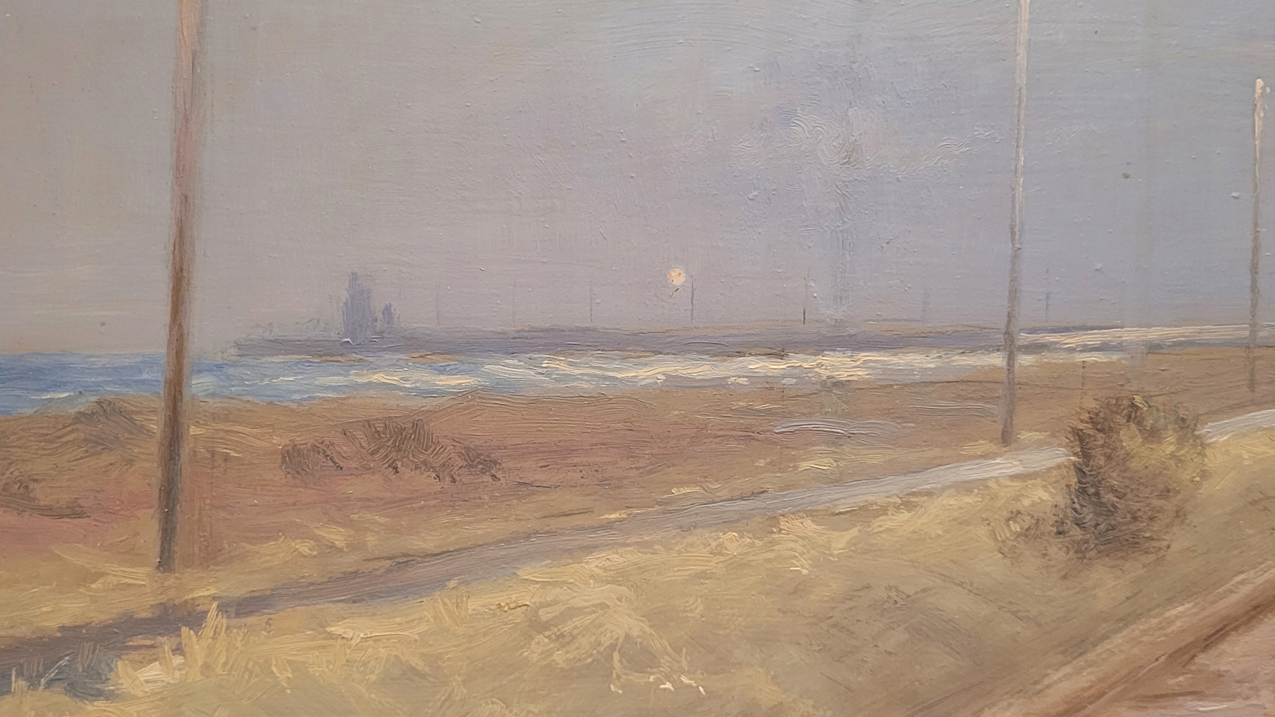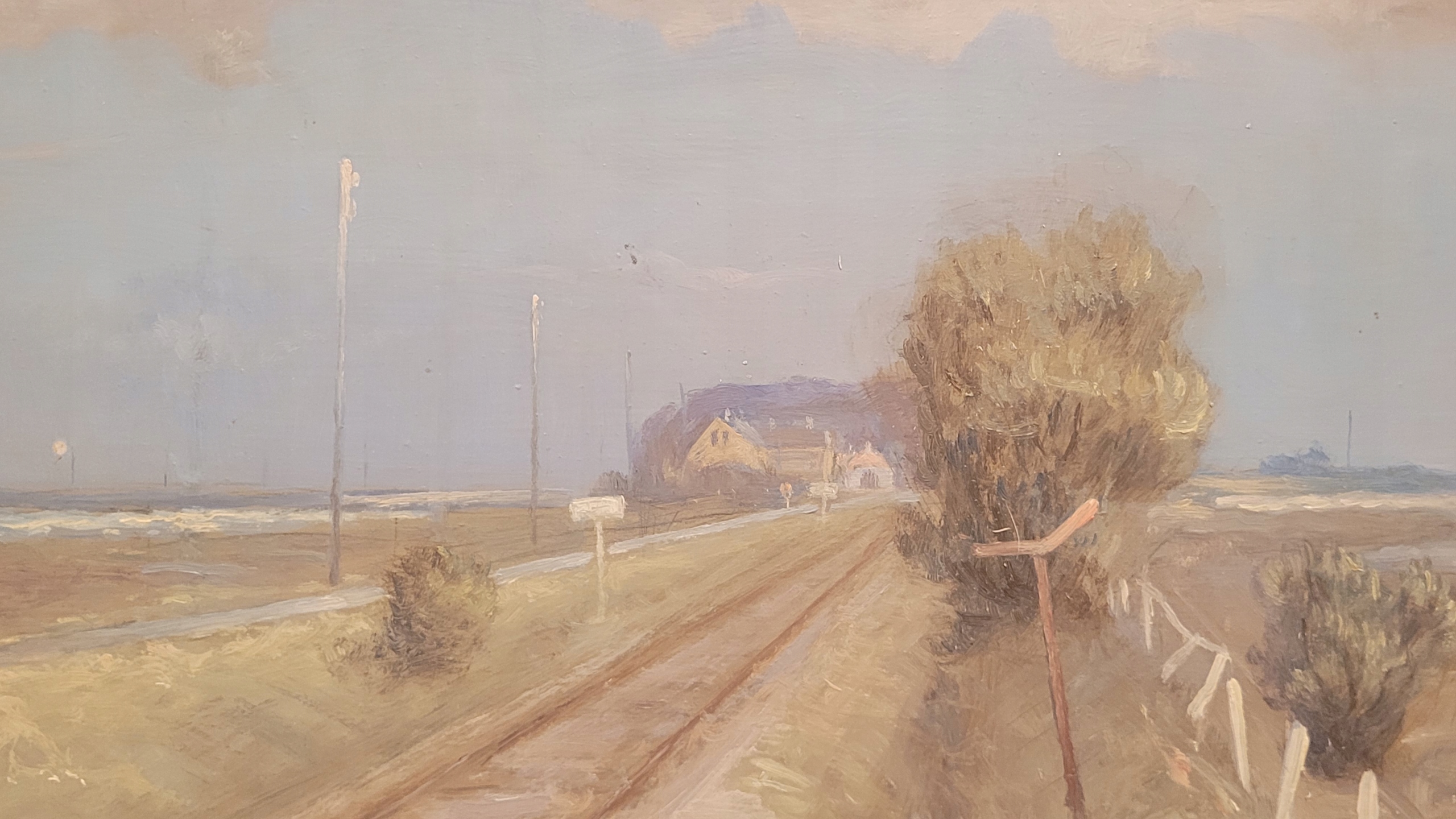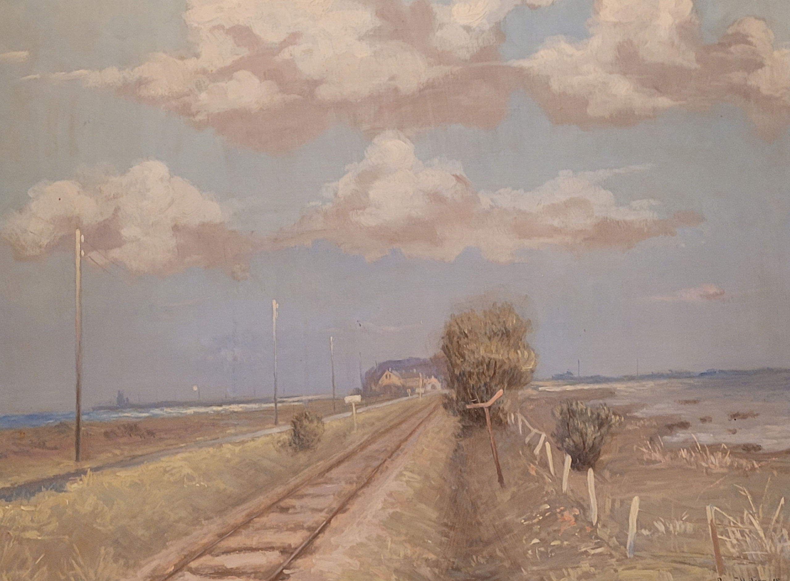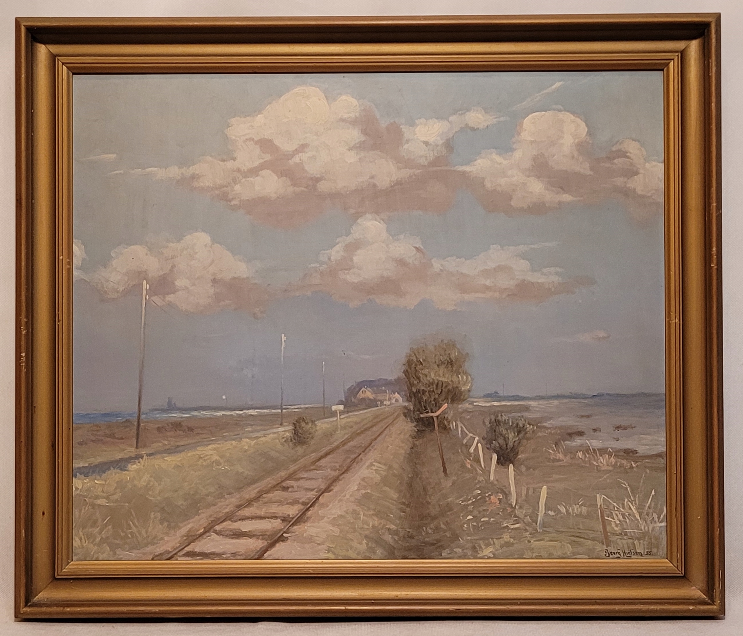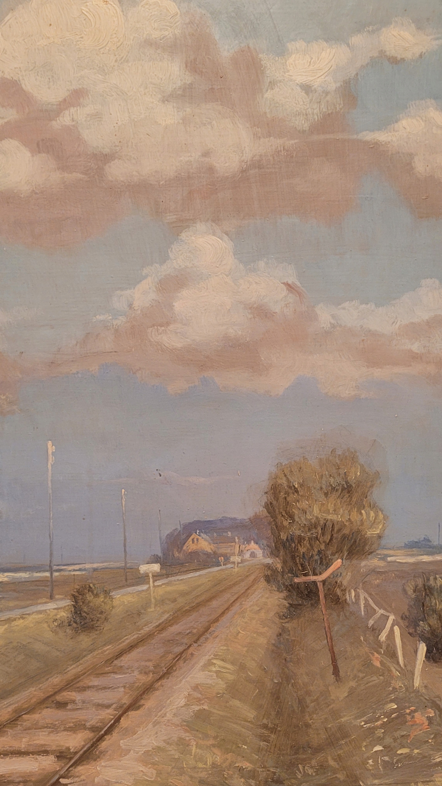 ГЕОРГ НИЛЬСЕН - «ПЕЙЗАЖ С ЖЕЛЕЗНОЙ ДОРОГОЙ». Картина маслом 1955 года.