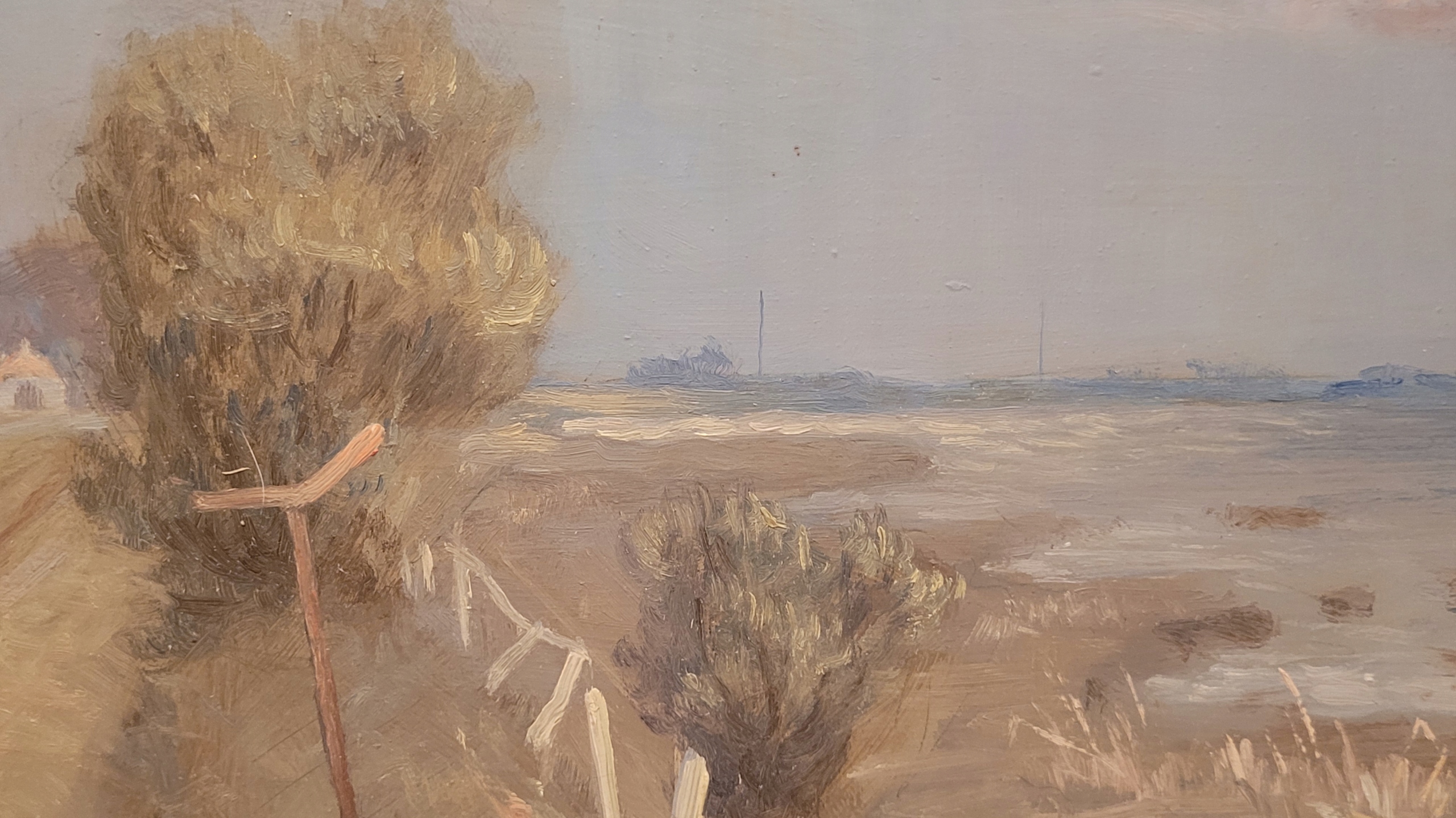 Предмет продажи — красивая, старинная картина маслом "ПЕЙЗАЖ С ЖЕЛЕЗНОЙ ДОРОГОЙ".