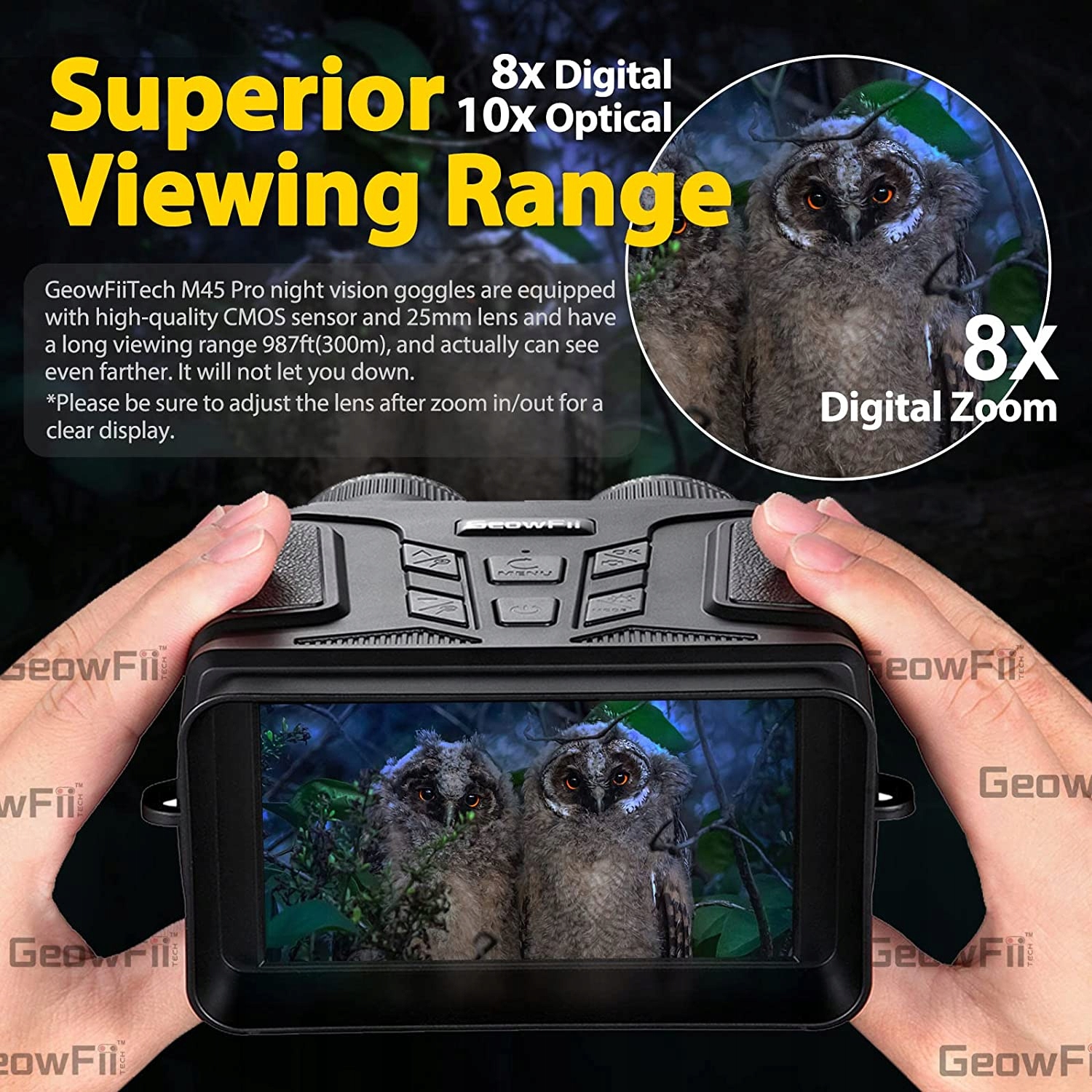 【Лучшая 100% темнота и дальняя дальность】 Бинокль ночного видения M45 Pro, оснащенный модернизированной линзой с многослойным покрытием 25 мм, 1,3-мегапиксельной CMOS-матрицей FHD с улучшенной ИК-подсветкой, 850-нм ИК-осветителем и 7-ступенчатой регулировкой, может стоить столь же недорого - эффективно обеспечивают четкое зрение на расстоянии до 300 м (984 футов) или даже дальше в 100% темноте. Он идеально подходит для инфракрасных биноклей для ночной охоты, охраны природы, наблюдения за птицами, кемпинга и скотоводства.