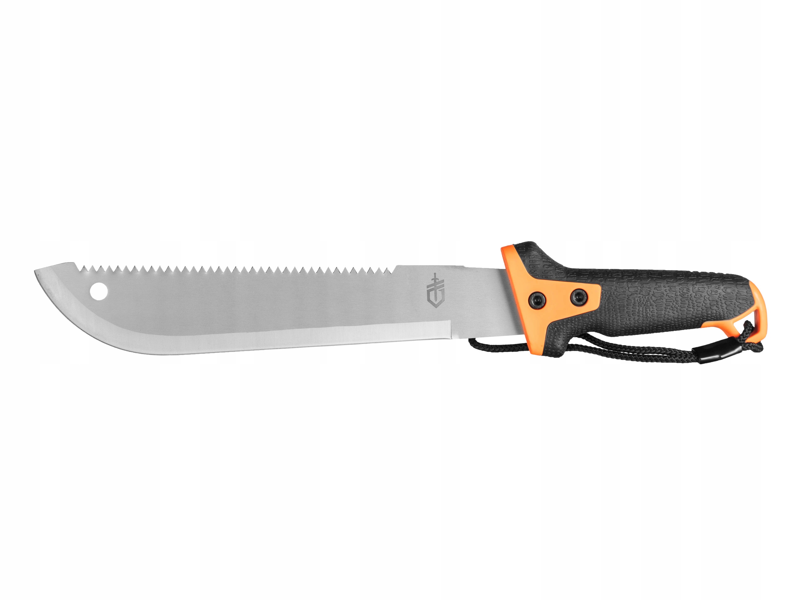 Рукоть мачете оживляют оранжевые вставки, повышающие его заметность и облегчающие поиск инструмента среди растительности.