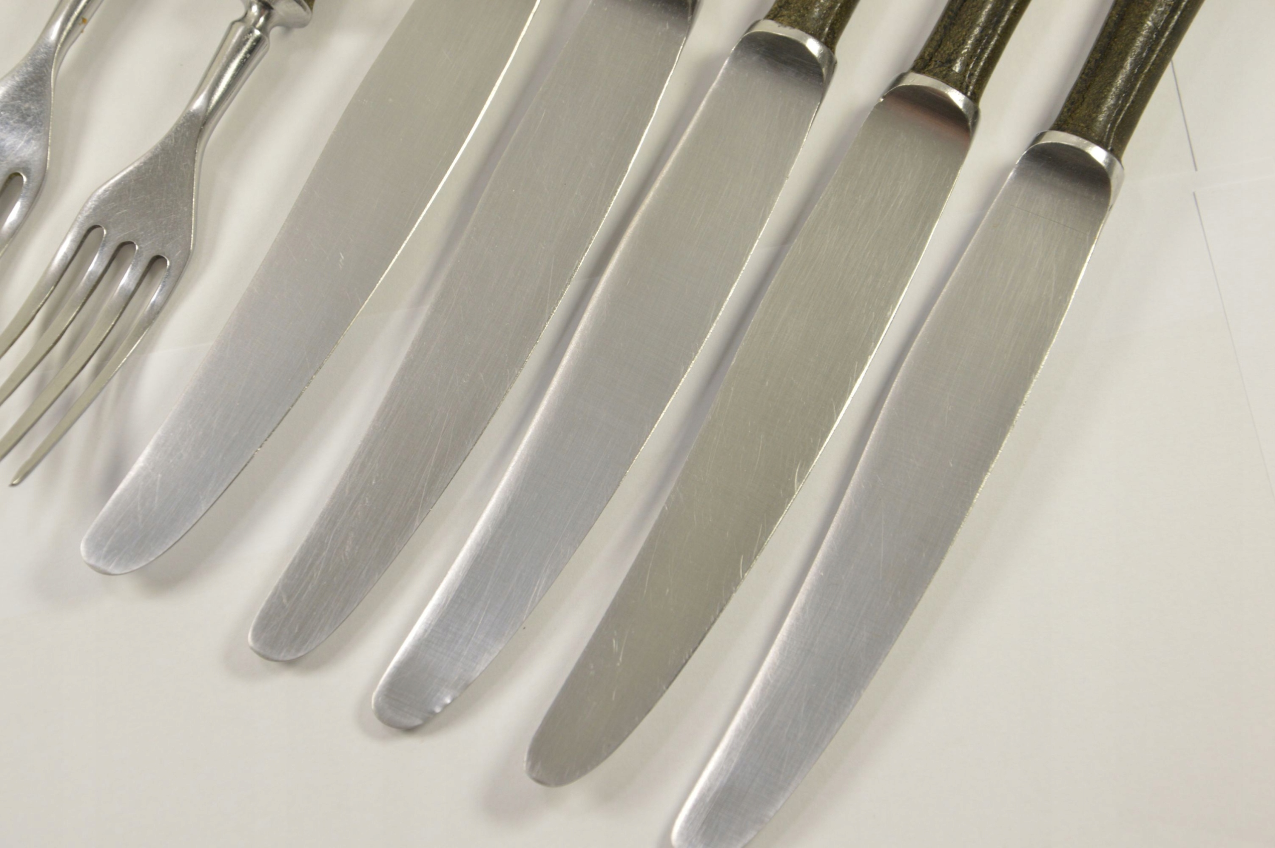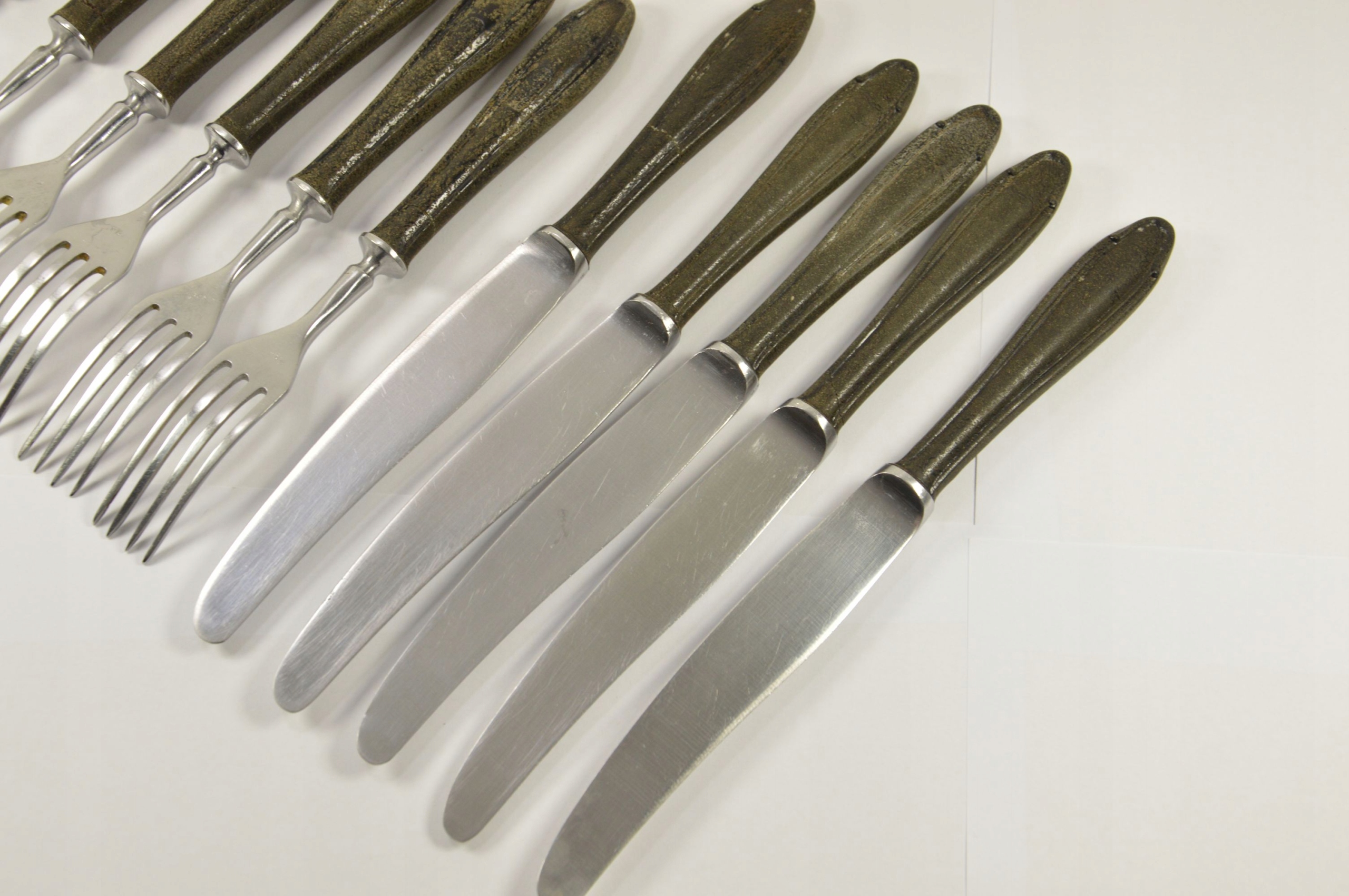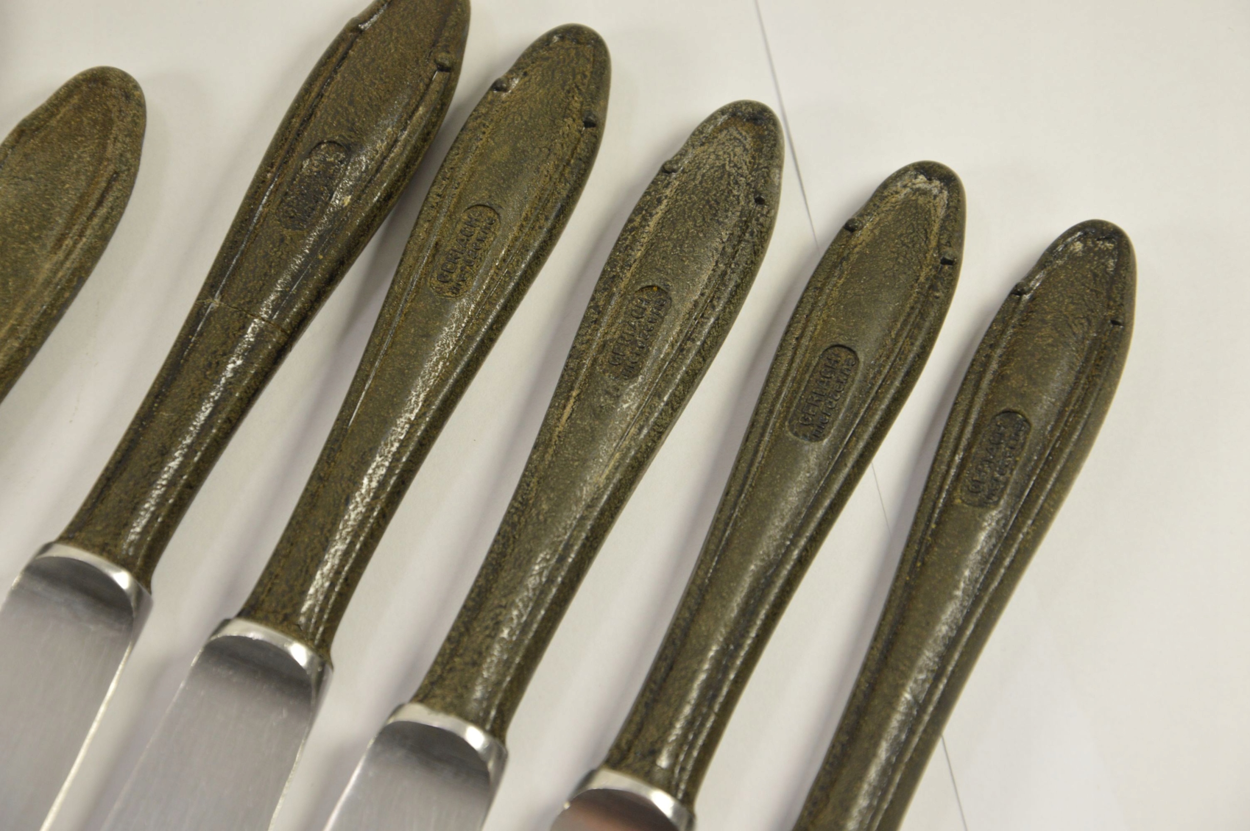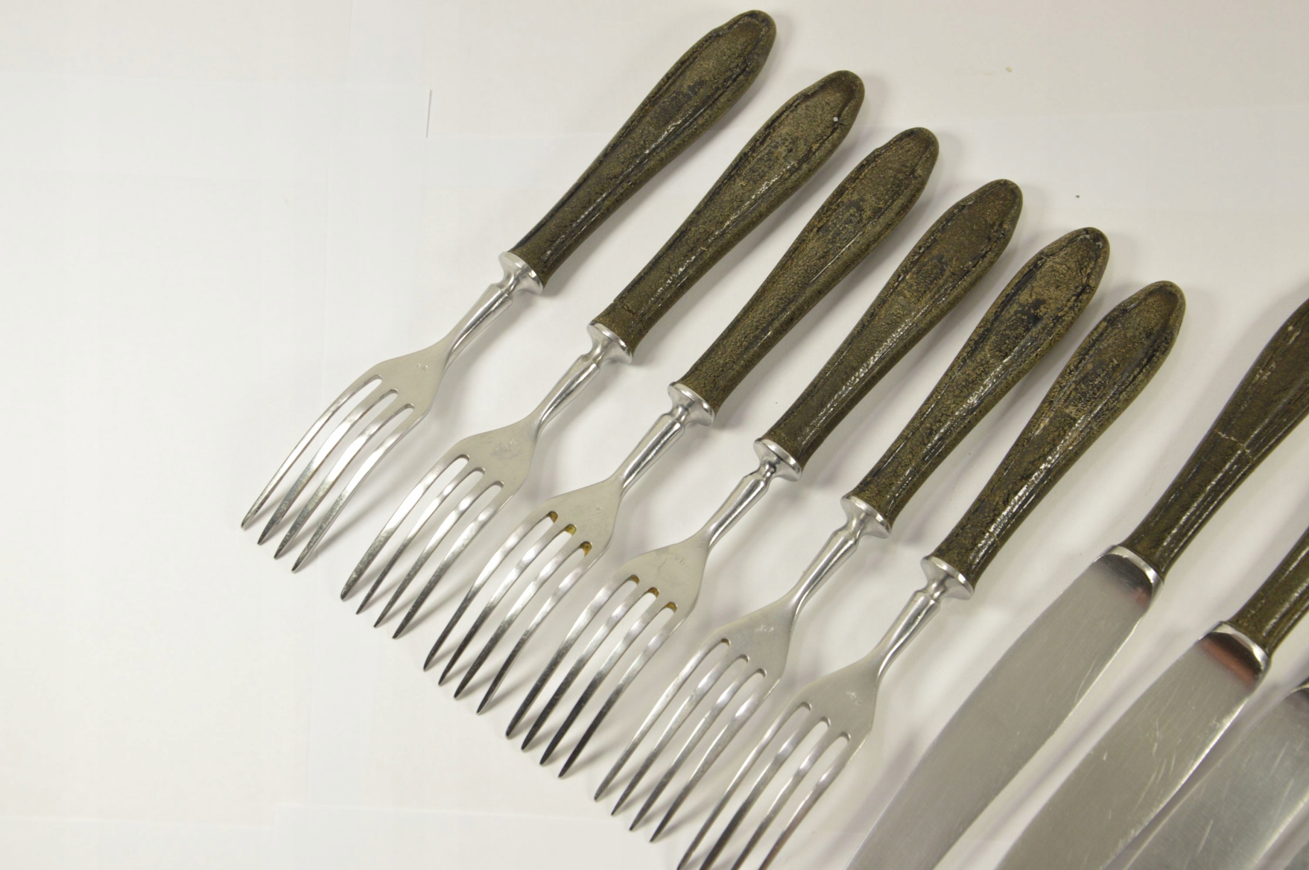 Набор столовых приборов Gerlach из бакелита. В набор входит 6 вилок и 5 ножей. Столовые приборы подписаны, видны следы использования, иногда старый бакелит трескается. Полнофункциональные столовые приборы.