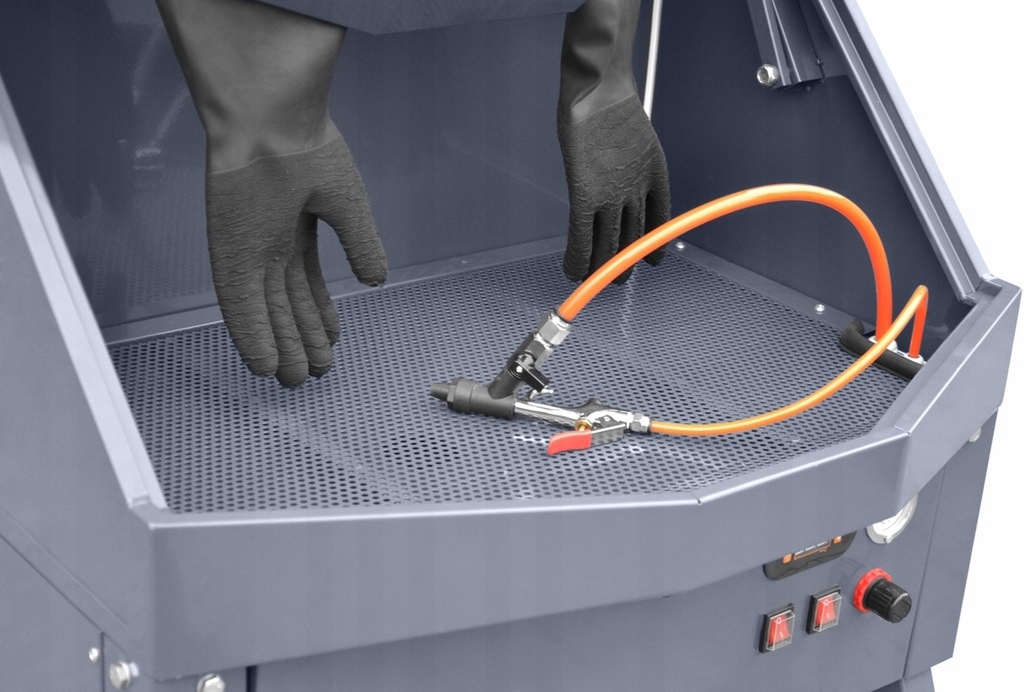 Стирка происходит в замкнутом контуре с использованием моющей жидкости нагретой до температуры до 70 градусов Цельсия > Препарат выбрасывается из сопла пистолета под давлением до 8 Бар, благодаря чему тщательно очищает труднодоступные места и сильно загрязненные детали от нагара, жира или масла. И температура, и жидкость повышают эффективность стирки. Имеет регулируемые ножки, уровень регулировки.