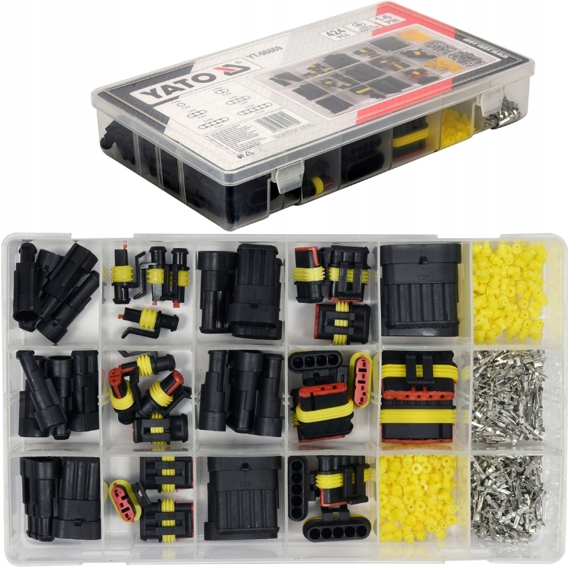 Набор из 424 герметичных разъемов 6 типоразмеров, соответствующих наиболее популярным диаметрам электрических кабелей. Используется в автомобильной промышленности, в том числе: для датчиков и устройств в автомобилях. Они обеспечивают очень хорошую изоляцию и герметичность.