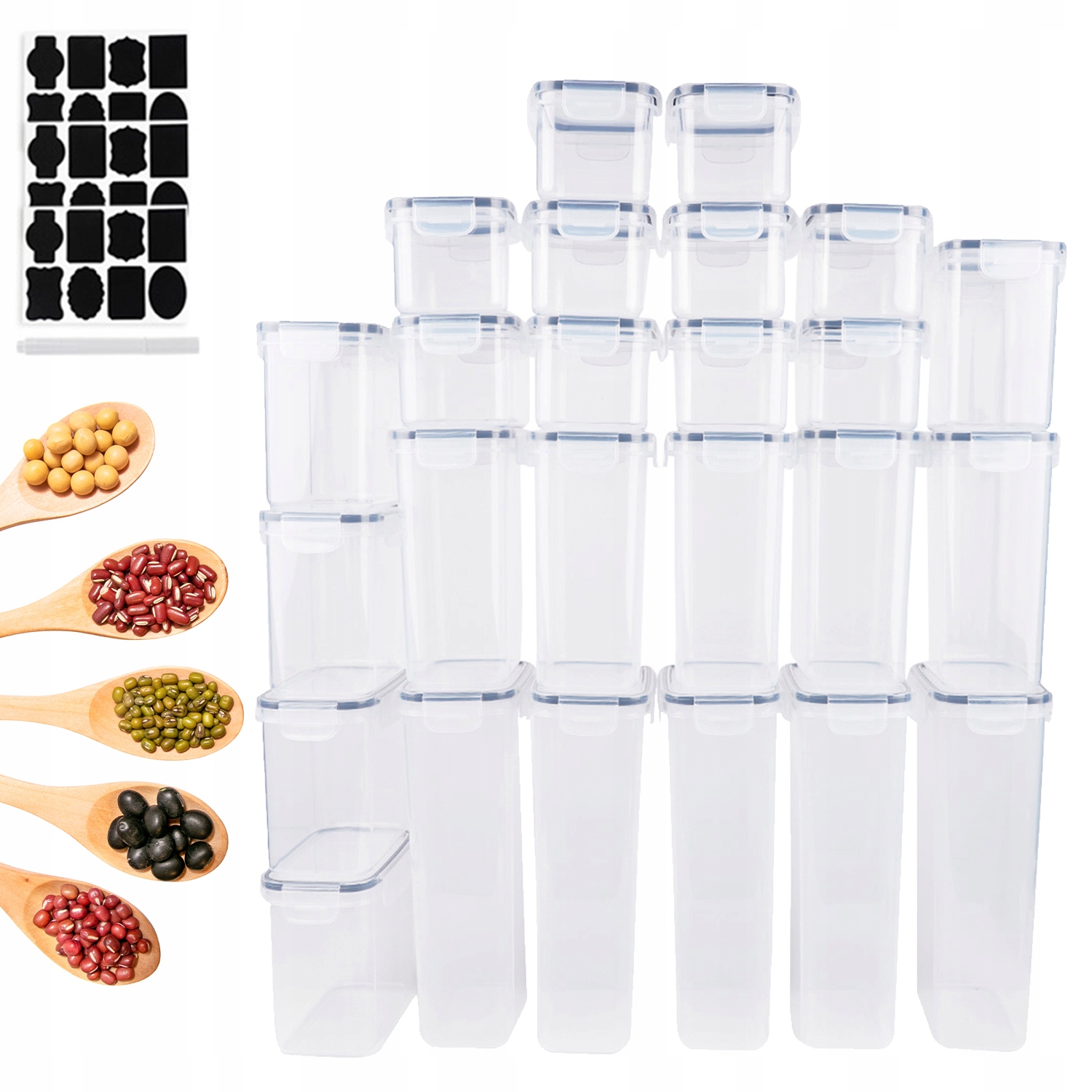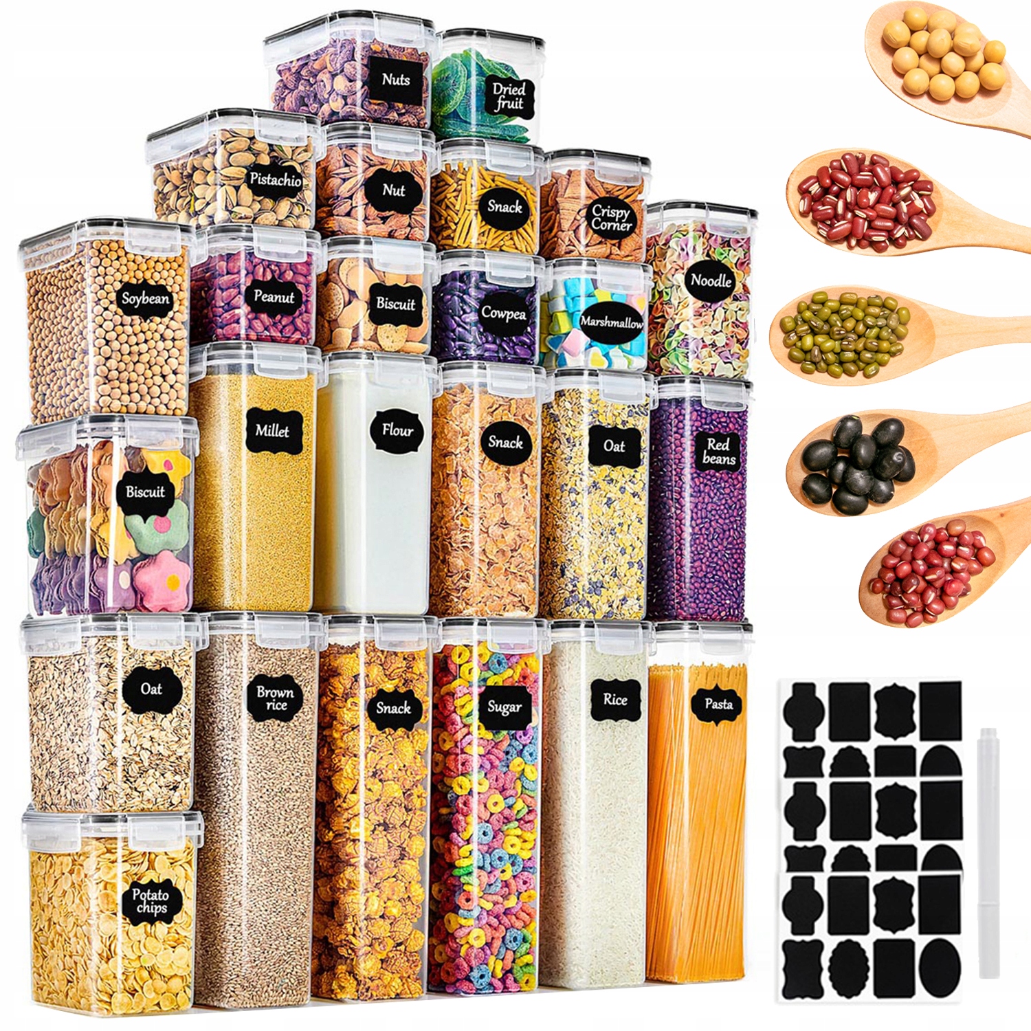- В разложенном виде вы получите четыре разных размера: 5*2,8 л+5*2 л+5*1,4 л+10*0,8 л+маркеры +24 этикетки, идеально подходящие для хранения макарон, муки и закусок. и т. д.